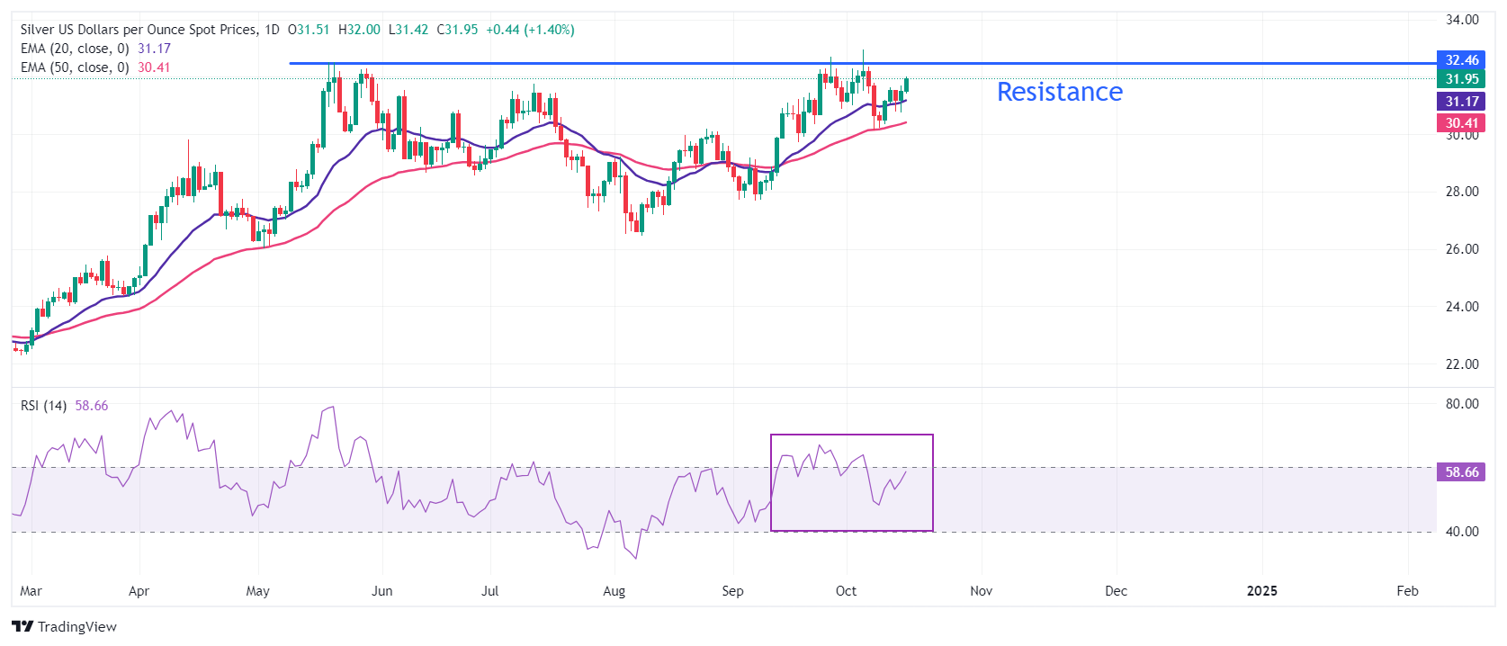 周三北美时段,白银价格(XAG/美元)跳升至关键阻力位32.00美元附近。由于越来越多的人猜测美国前总统唐纳德-特朗普将在即将到来的总统大选中获胜,投资者的风险偏好有所减弱,白色金属因此上涨。预计特朗