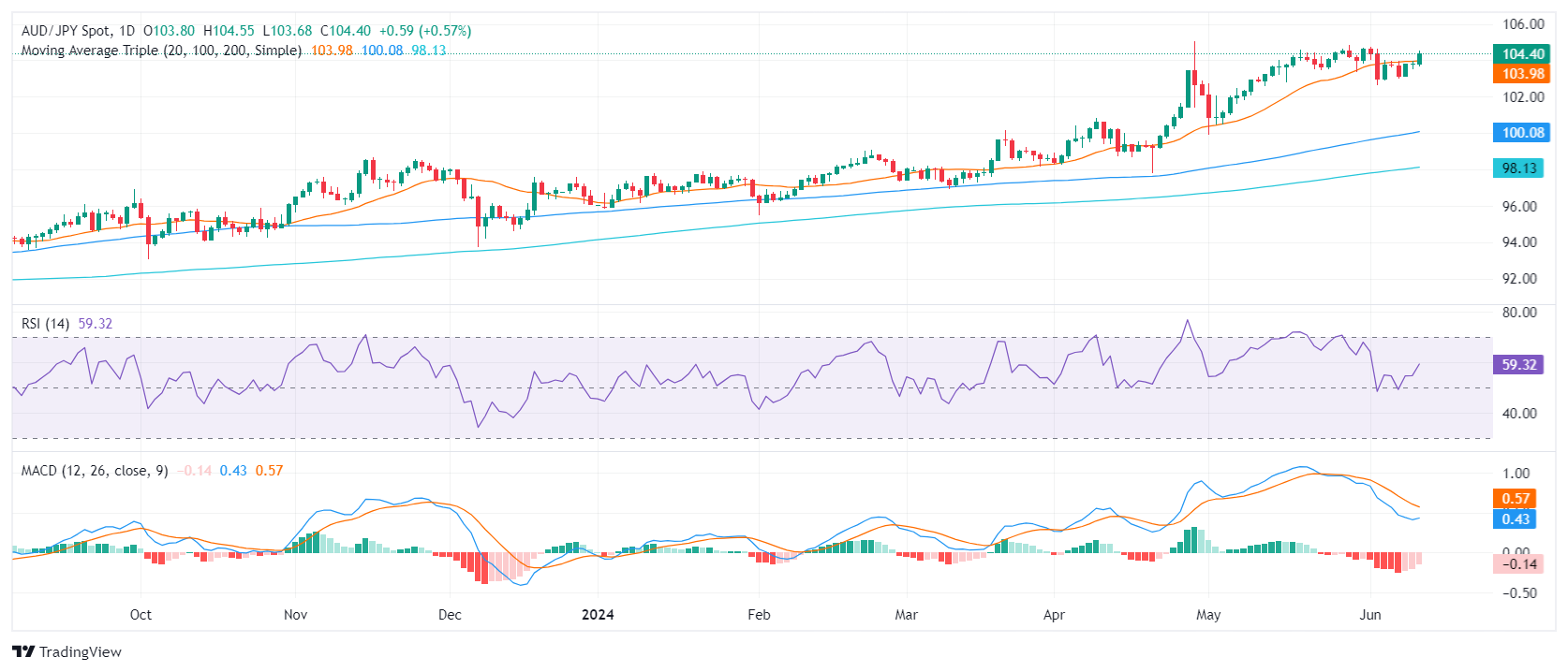 周三交易中,澳元/日元走强,突破了位于 103.90 的 20 日简单移动均线 (SMA)。这可能是一个积极的信号,表明澳元兑主要货币对价格走强。不过,目前澳元/日元盘整阶段表明,持续上涨动能可能不足