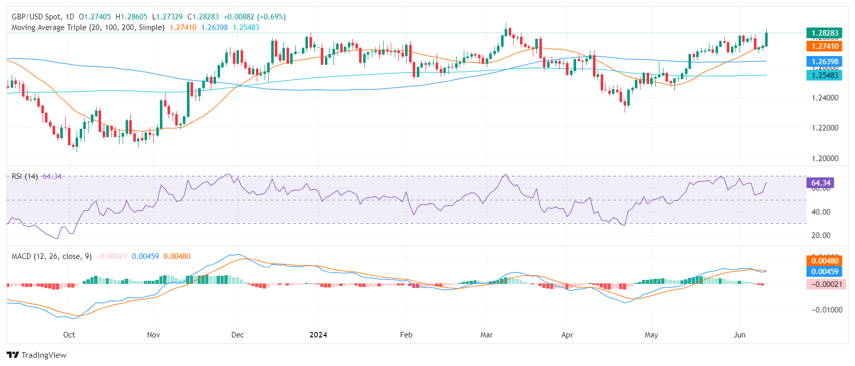 周三,英镑/美元在美联储(FED)决定将利率维持在5.25%-5.50%不变后跌去部分涨幅,报1.2830。令美元走强的是,点阵图显示美联储成员认为 2024 年将降息两次而非三次。