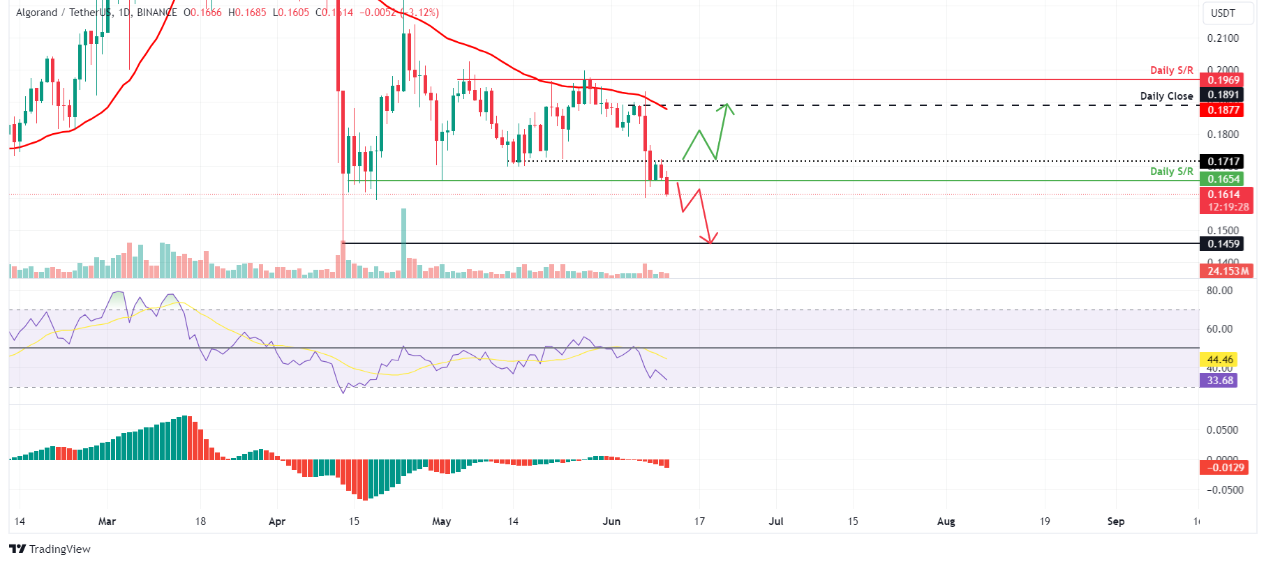 Algorand (ALGO)价格周二即将跌破日支撑位0.161美元,延续5月27日在0.200美元附近被跌破的两周跌势。相对强弱指数(RSI)和令人敬畏的振荡器(AO)动量指标都显示了看跌的势头。