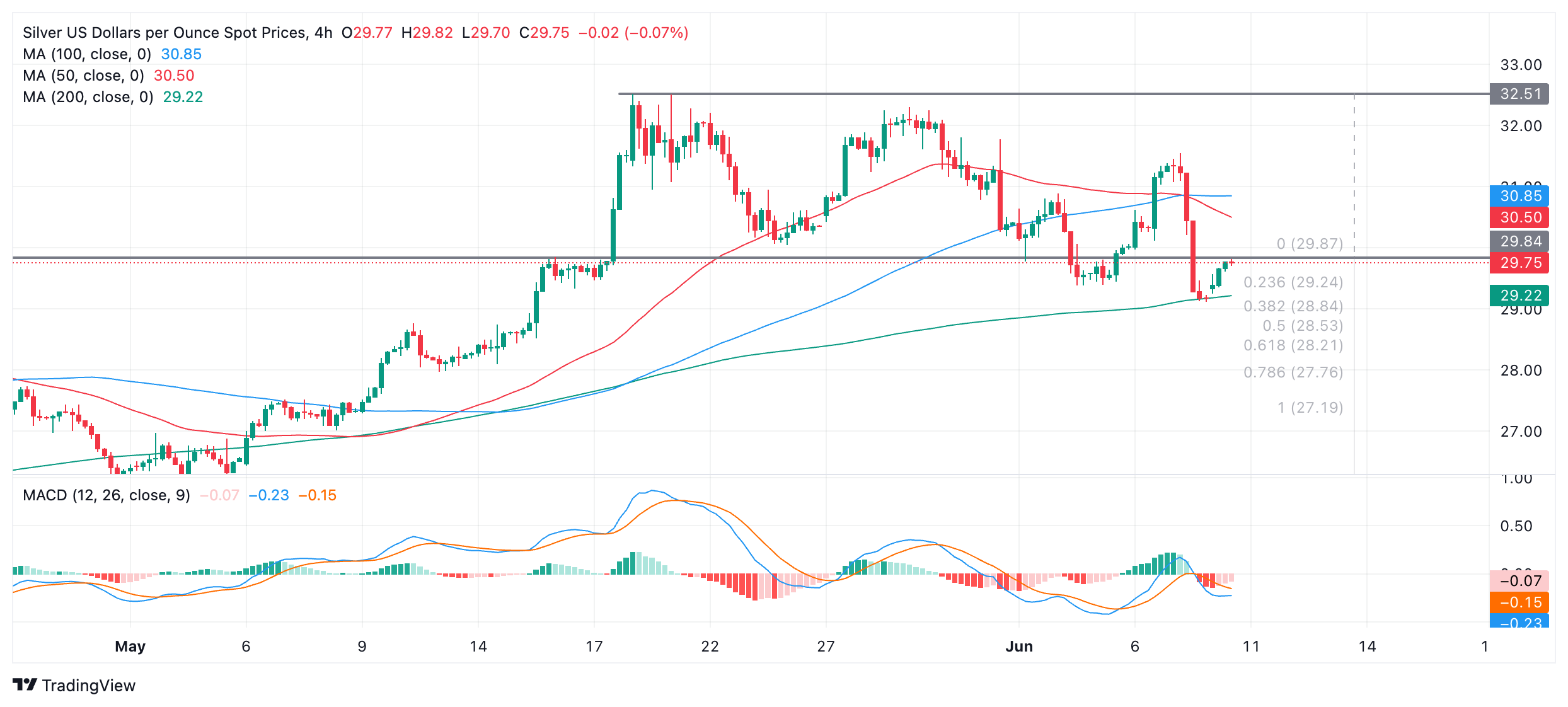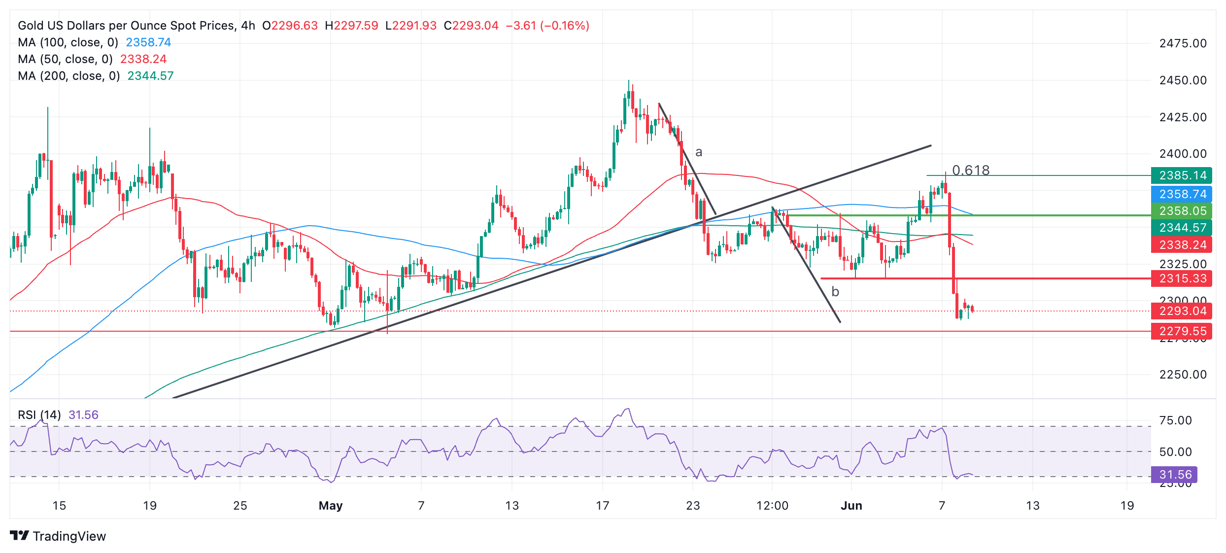 白银(XAG/USD)在 5 月中旬触顶后形成的小型区间底部被击穿,在四小时图上呈阶梯式下跌。