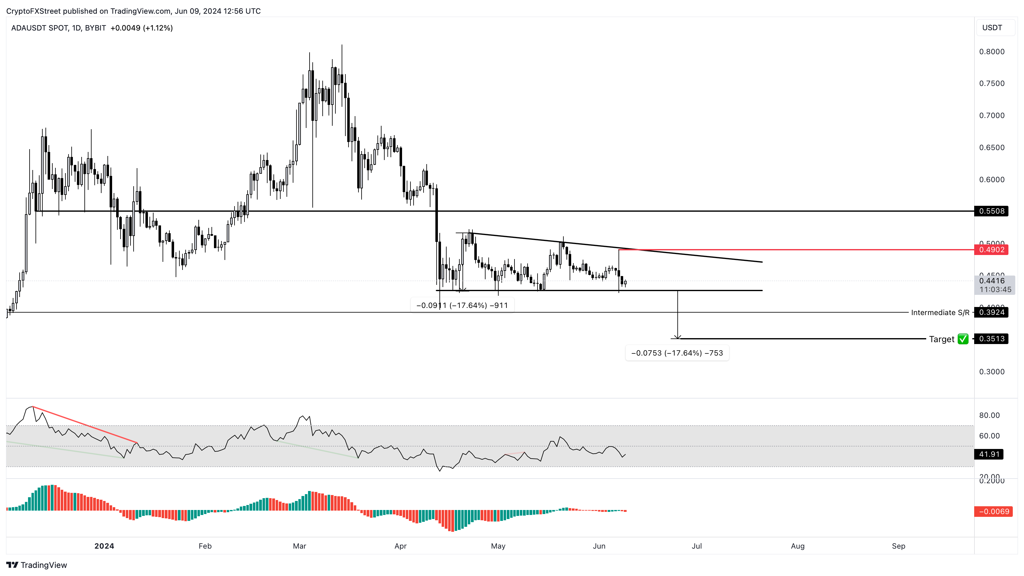 卡达诺价格盘整后,可能很快引发突破,使卡达诺价格下跌两位数,接近关键支撑位。 其他消息:卡达诺价格出现做多信号,但多头会配合吗? 卡达诺价格日益接近崩盘 卡达诺价格已从 2024 年的高点 0.810
