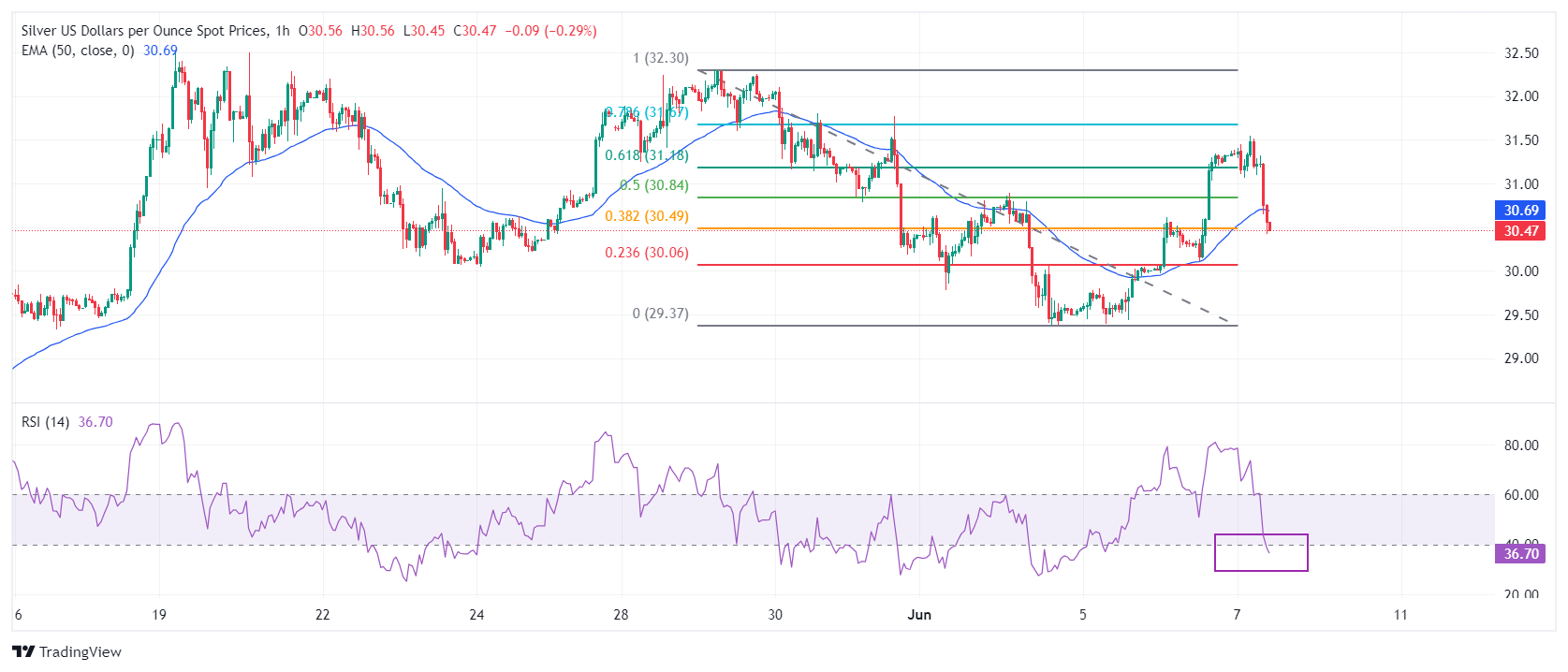 周五欧洲时段,银价(XAG/USD)大幅下跌至 30.50 美元。白银价格走软的原因是多重利空因素,如投资者在美国 5 月非农就业数据(NFP)公布前持谨慎态度,以及中国 5 月底黄金储备较 4 月持