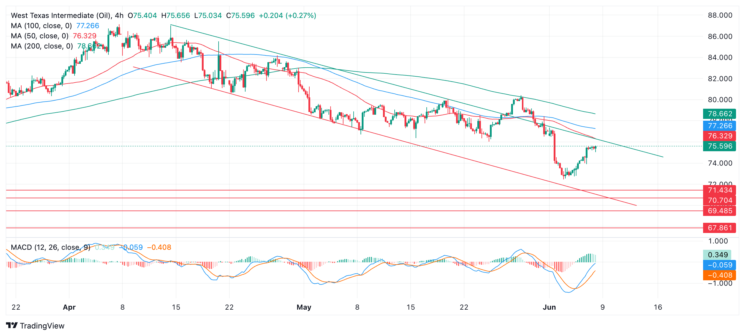 WTI 油价 (OIL) 自 4 月初以来一直在下降通道中走低。在用于分析短期趋势(最多 6 周)的 4 小时图上,油价处于下降趋势中。鉴于 "趋势是你的朋友",预计这种趋势将持续下去。