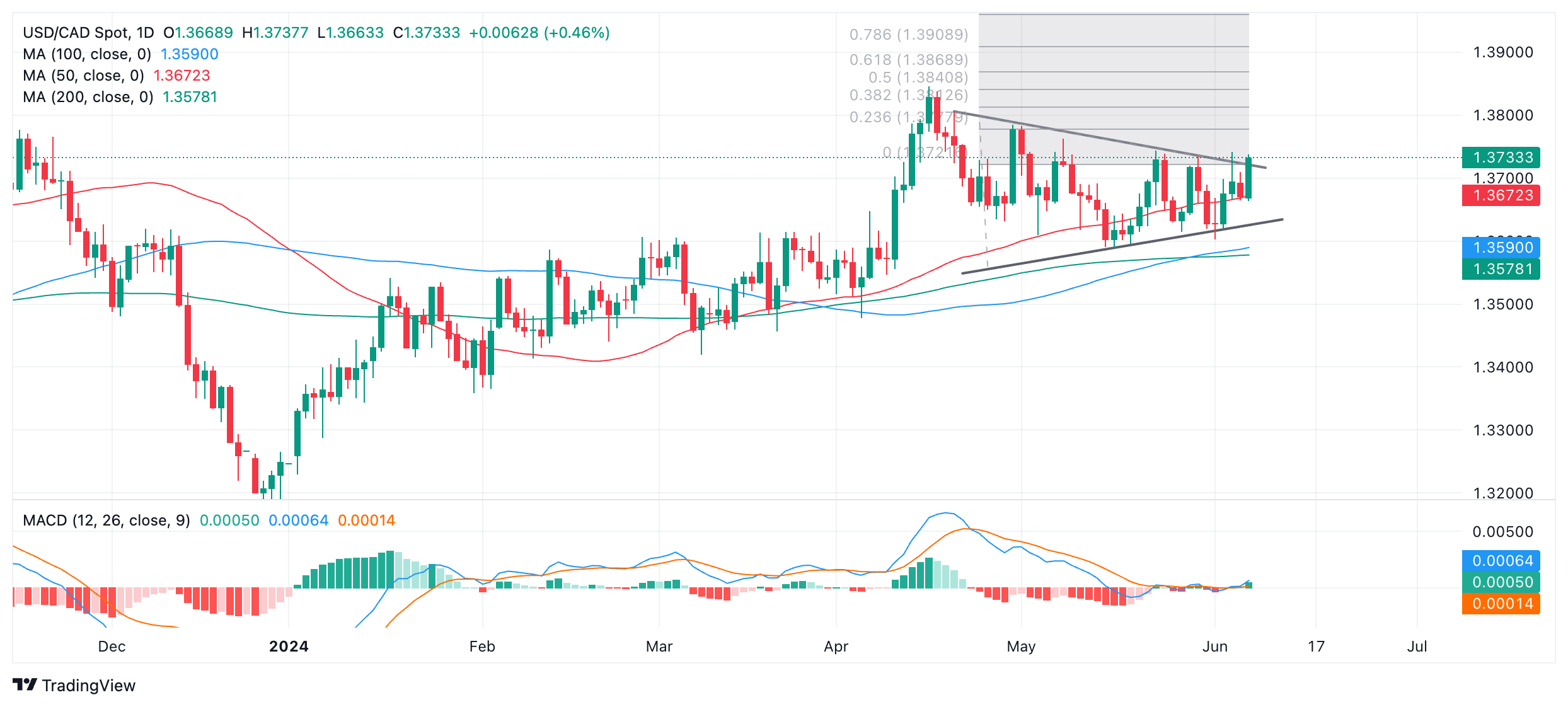 美元/加元正在向上冲击大型对称三角形价格形态的上边界线,有可能向上突破。