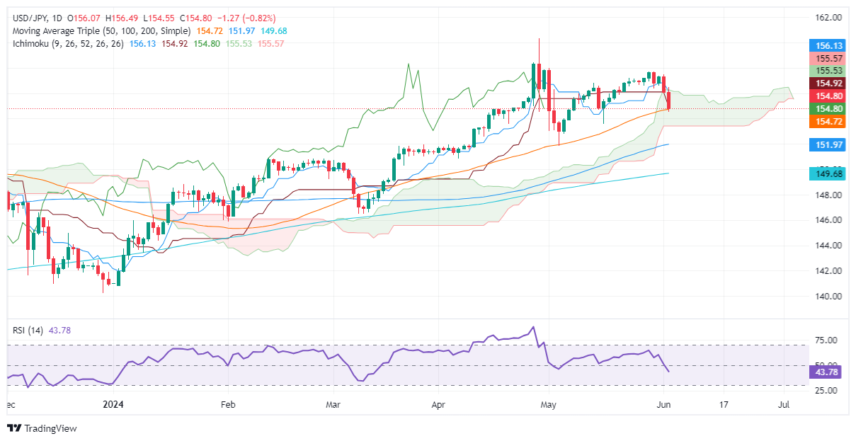 美国时段尾盘,美元/日元暴跌约 0.80%,因为美国的经济数据助长美联储可能在 9 月降息的前景。美元/日元继触及日线高位 156.48 后交投于 154.72。
