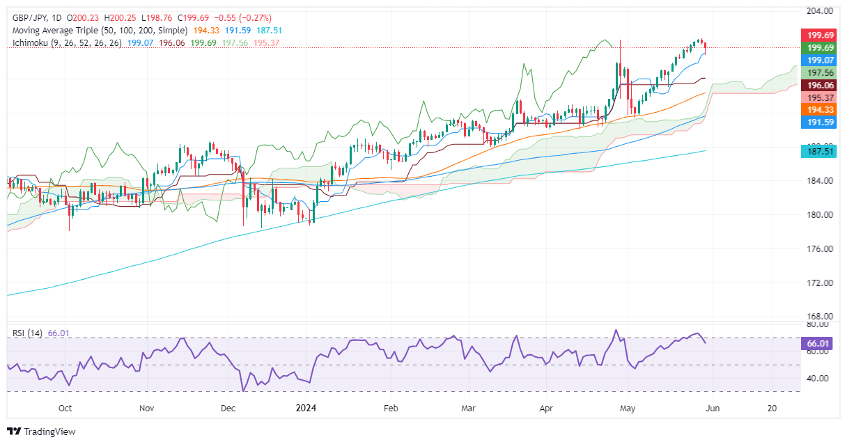 英镑/日元连续第二日扩大跌幅,此前英镑/日元从 5 月 29 日触及的年内迄今(YTD)高点 200.74 附近回撤。截至发稿时,英镑/日元报 199.68,小幅下跌 0.24%。