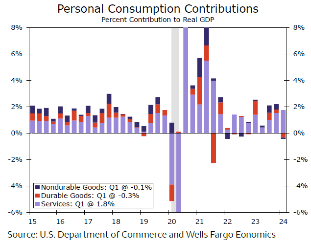 对第一季度GDP的修正将整体增长率从之前的1.6%下调至1.3%,其中消费品支出的大幅下降是调整的主要原因。企业利润下滑,但这种下滑夸大了近期的疲软。 修订对消费品支出造成了冲击 今年第一季度,美国经