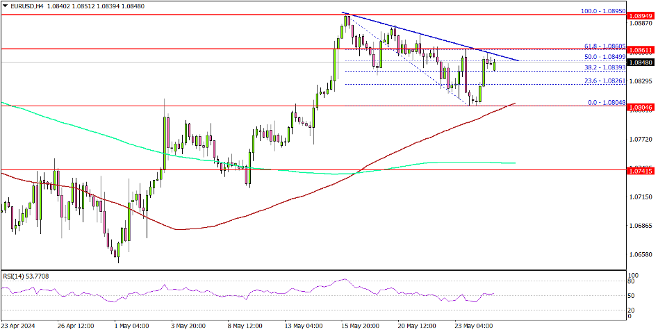主要亮点: 欧元/美元突破 1.0800 支撑位后,显示出看涨迹象。 欧元/美元有望突破 4 小时图上的 1.0880 阻力位。 欧元/美元技术分析 4 小时图显示,欧元/美元甚至稳定在 200 简单