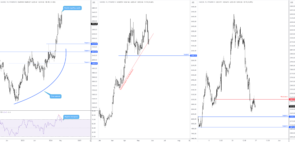 虽然黄金上涨趋势依然完整,上周刷新历史高位 2,450 美元,但势头出现减弱的迹象,因为黄金创下了今年最大的单周跌幅(下跌 -3.3%)。 大级别周期显示更有利于空头 本周,周线图显示金价收盘走出看跌