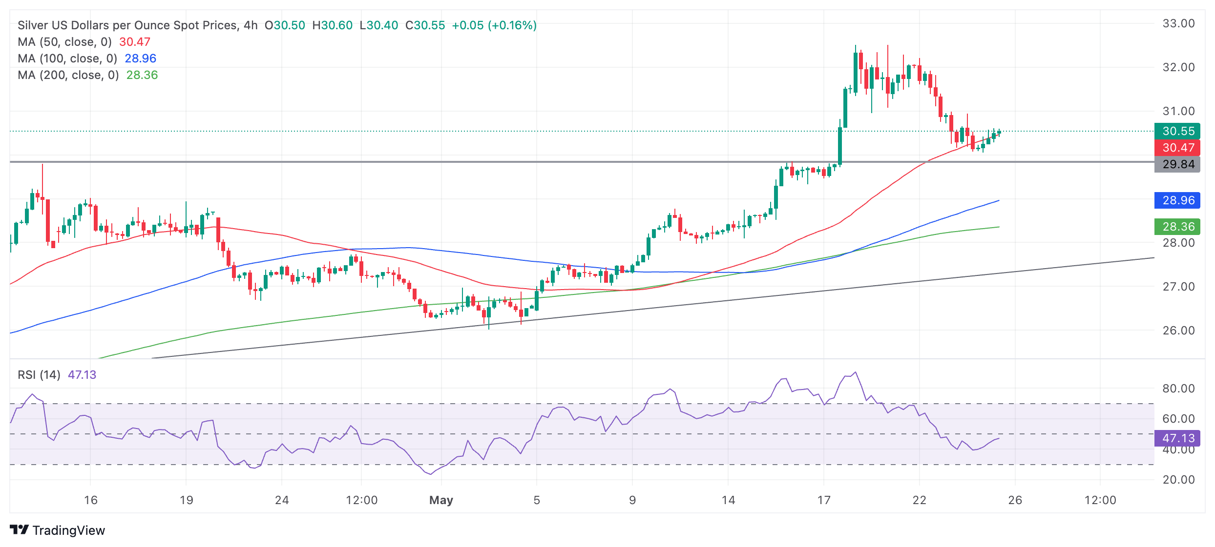 白银(XAG/USD)在 5 月 19 日触及 32.51 美元的高点后回调。目前接近主要支撑位 30.00 美元,即四年盘整区间的顶部。