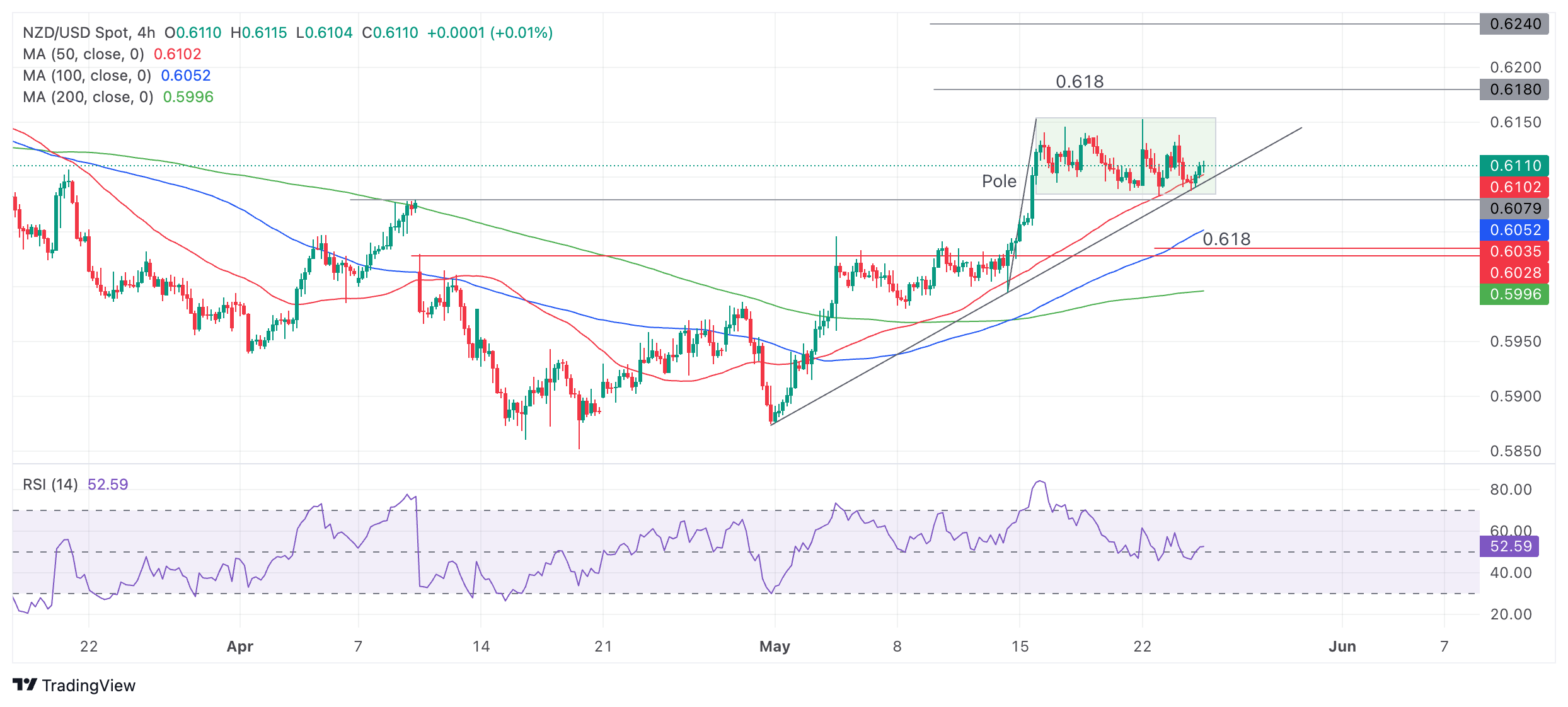 纽元/美元在过去一周左右的时间里形成了区间整理(图表中的阴影矩形),这可能代表了看涨旗形延续形态的正方形。