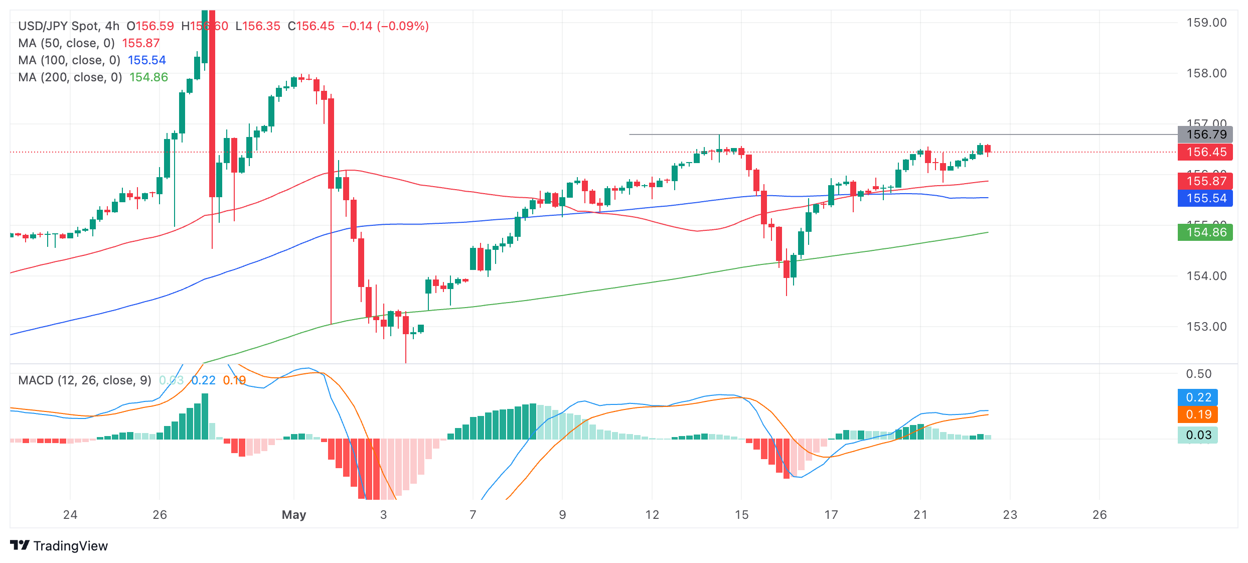 美元/日元已上扬至重新测试技术阻力位 156.79 附近(5 月 14 日高点),有可能暂时回落。