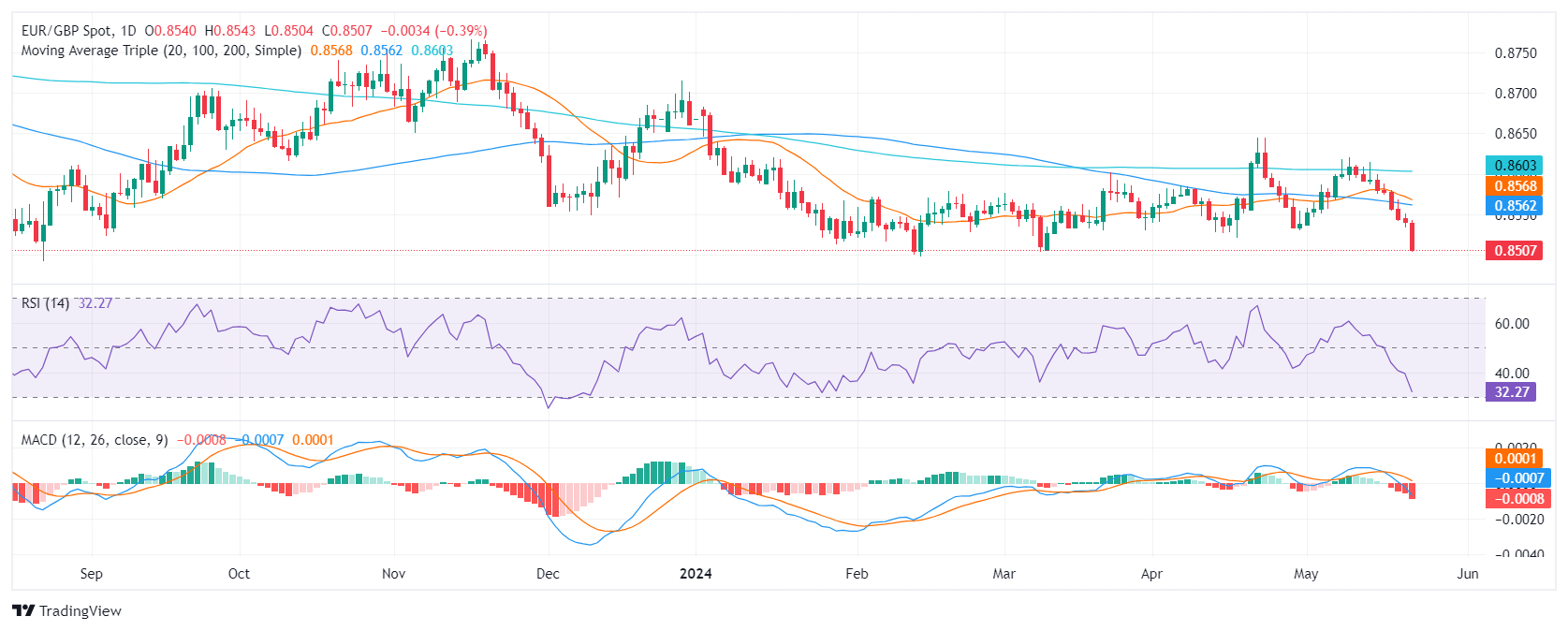 国家统计局(ONS)公布的通胀数据高于市场预期,英镑走强,欧元兑英镑周三走低至 0.8505。通胀数据推低了英国央行(BOE)6月份降息的可能性,从而提振了英镑。