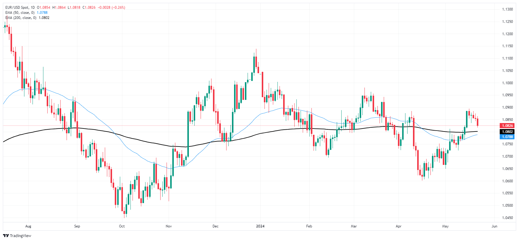 周三,欧元/美元走低,此前美联储(Fed)最新会议纪要显示,联邦公开市场委员会(FOMC)决心等待更多证据证明通胀将放缓至2%,这使得市场风险偏好下降,因为寻求降息预期的投资者原本希望美联储释放鸽派。