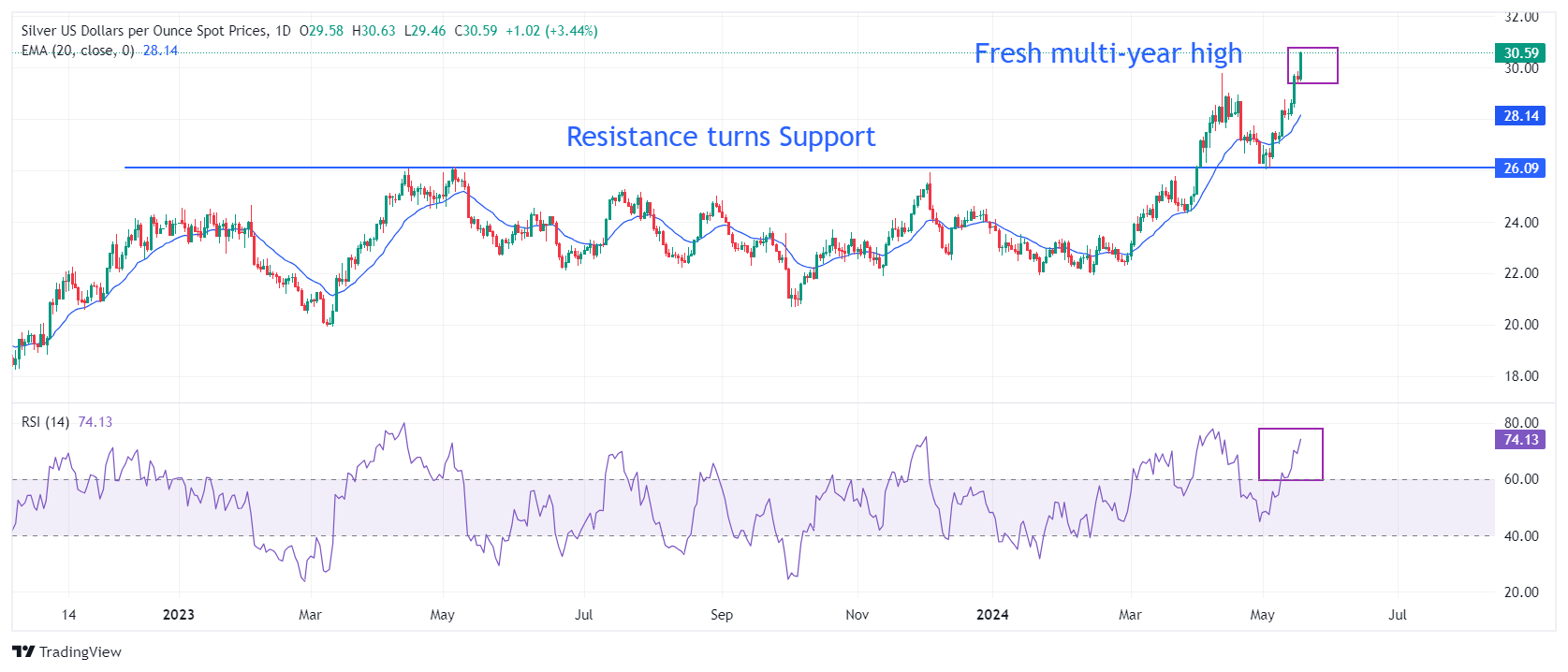 白银价格预测:美联储降息前景明朗,白银/美元刷新多年新高至30.50美元
