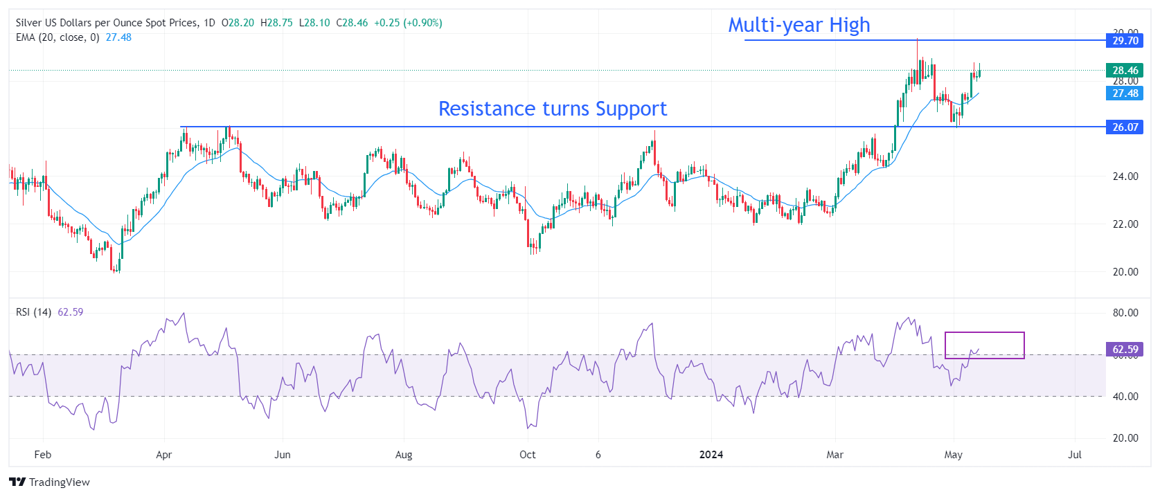 白银价格预测:白银/美元逼近两周高点 28.80 美元,关注美国通胀数据