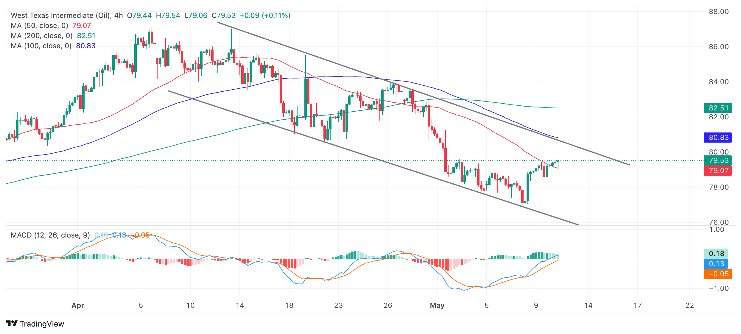 油价正在走高,周五撰写本文时的换手率为 79.50,在下降通道内上扬。