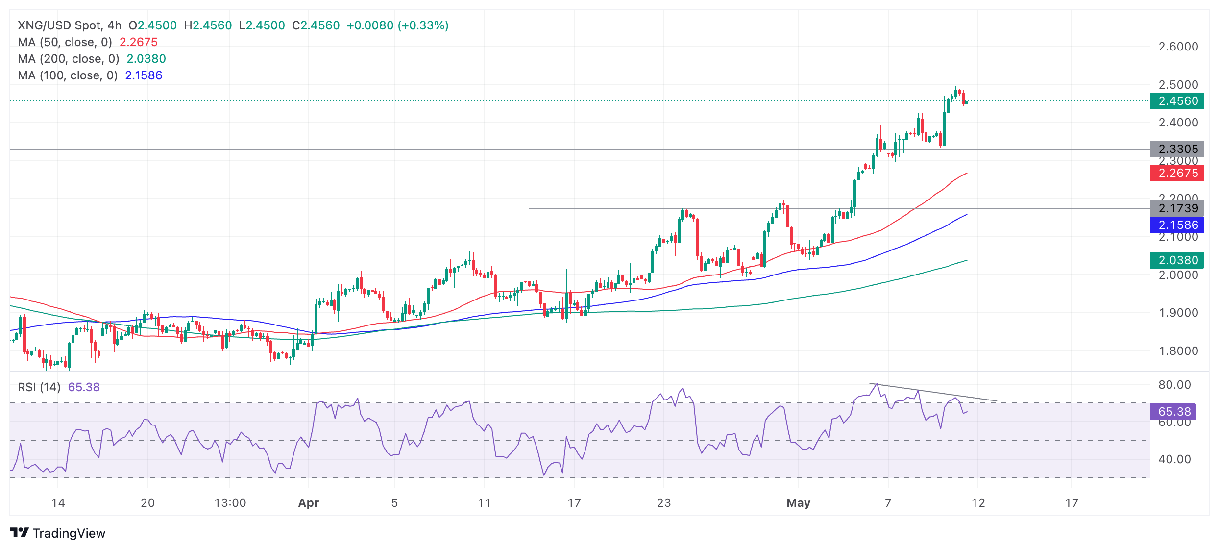天然气价格正处于短期上升趋势中,这一点从 4 小时图的波峰和波谷上升序列以及交易价格高于所有关键移动平均线的事实中可以得到证明。