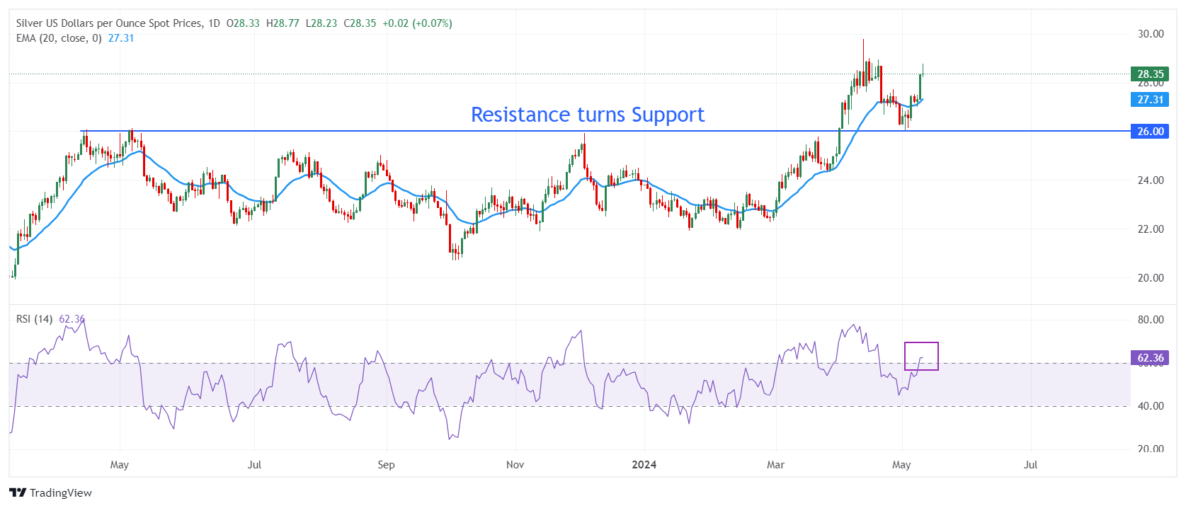 白银价格预测:因对美联储降息持乐观态度,白银/美元在28美元上方保持涨势