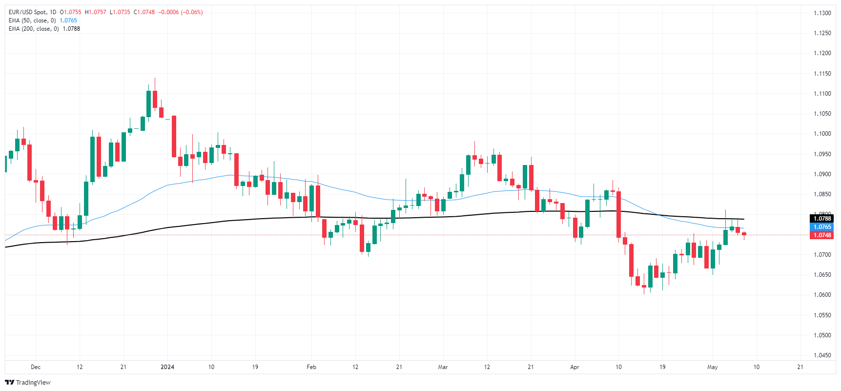 欧元/美元短线正回归震荡,维持在 1.0750 附近,并牢牢停留在本周开盘交易区间内。周四欧洲市场资金流动稀少,德国和法国市场因耶稣升天节假期休市,而美国数据在周五密歇根大学消费者信心指数公布之前将公