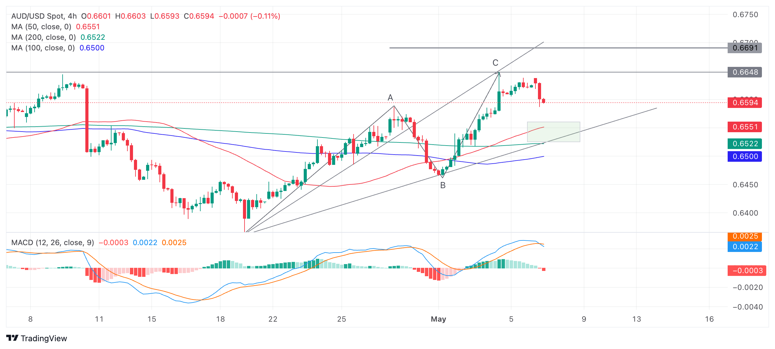 澳元/美元周二在0.6590附近交投,继续从5月3日的高点0.6600上方回调修正。