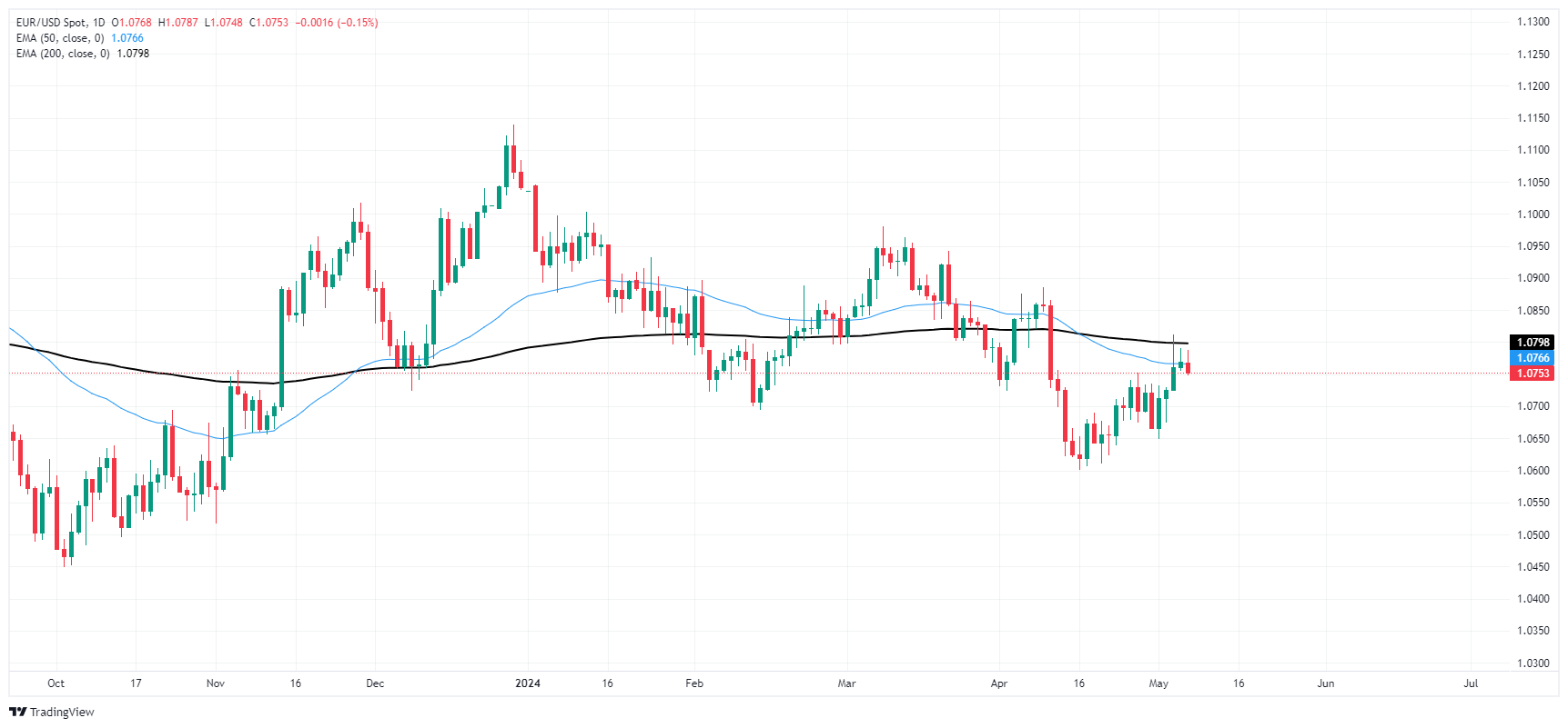 欧元/美元缺乏方向动能,徘徊在 1.0750 附近