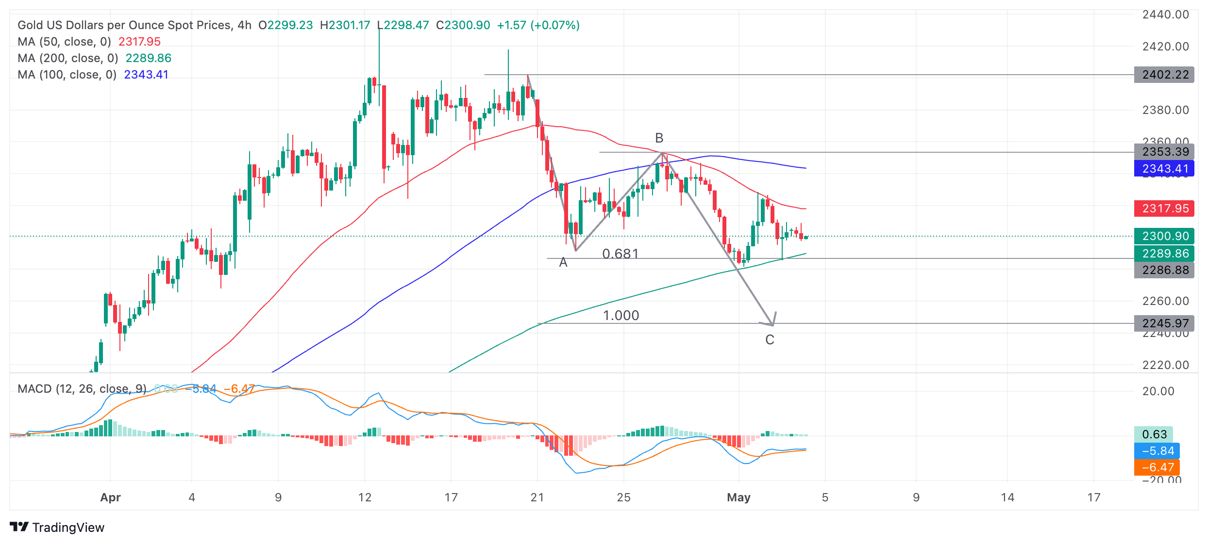 金价(XAU/USD)周五走低,盘中一度跌至略高于2300美元的水平,原因是在整体市场情绪高涨的情况下,贵金属的避险需求有所减少。