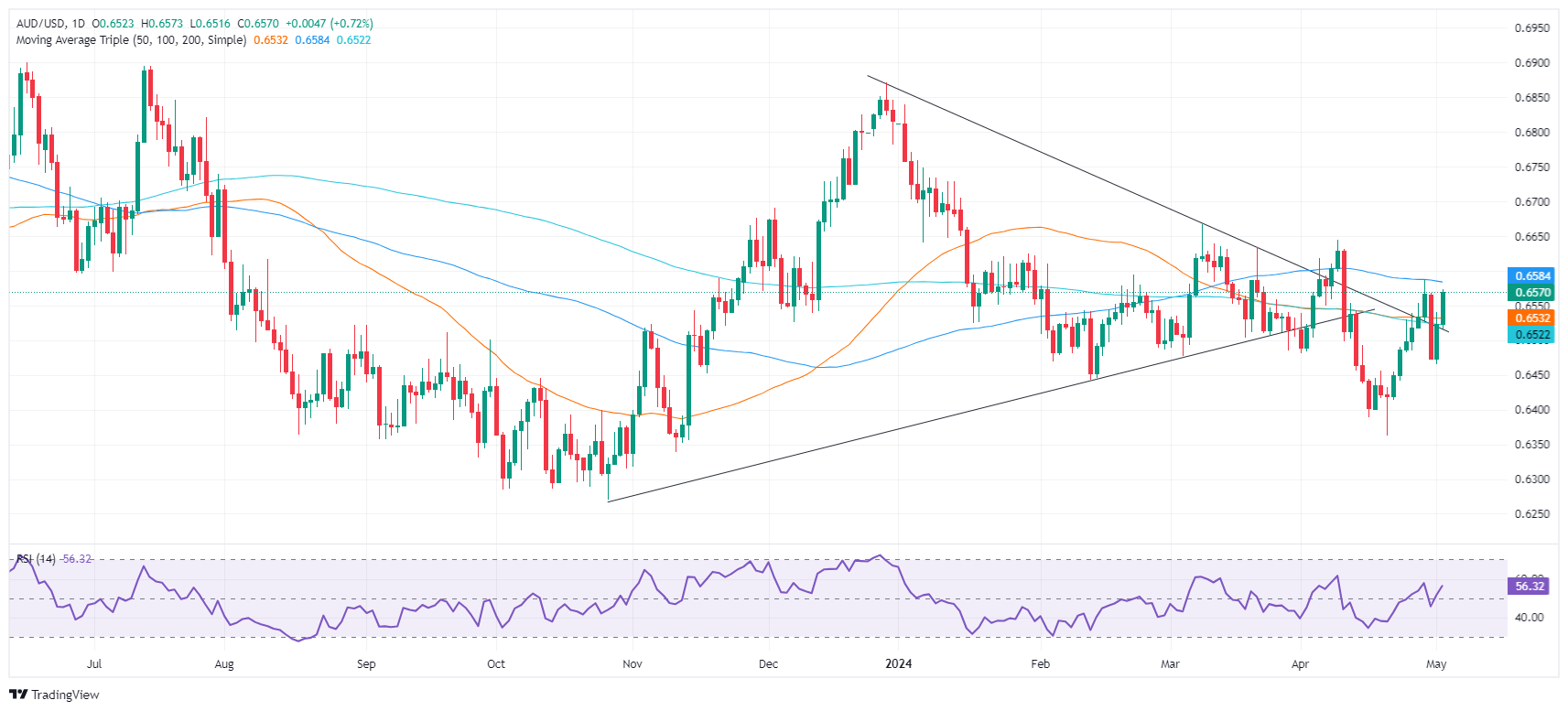 在美国经济数据稳健的背景下,乐观的市场人气提振澳元/美元在周四强势上涨 0.65%。然而,美联储(Fed)最新的货币政策决议仍在打压美元指数,该指数收跌0.27%。目前澳元/美元交投于0.6567,上