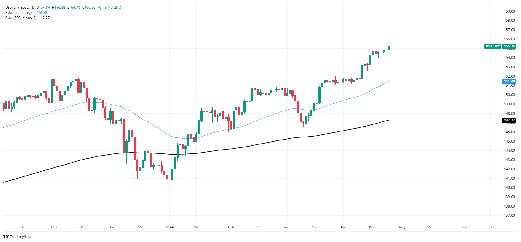 美元/日元周三突破进入1990 年 6 月以来的最高点,34 年来首次升至 155.40 附近,日元继续全盘暴跌。据《日经新闻》报道,日本央行(BoJ)预计将讨论 "日元加速贬值的影响",这向市场参与