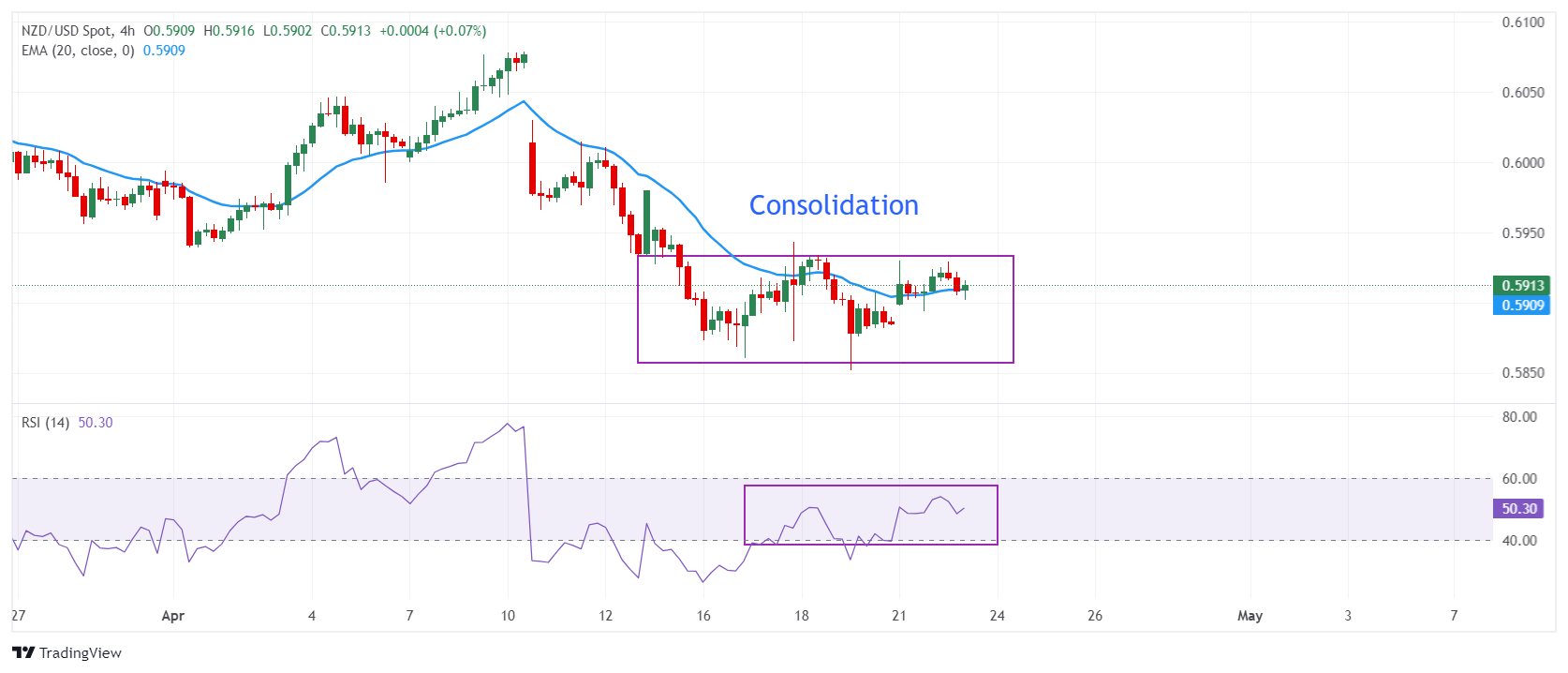 周二欧洲时段,纽元/美元跌至关键支撑位0.5900附近,此前试图突破近期阻力位0.5930失败。由于投资者在等待将于周五公布的美国3月份核心个人消费支出物价指数(PCE)数据,预计纽元/美元将横盘整理