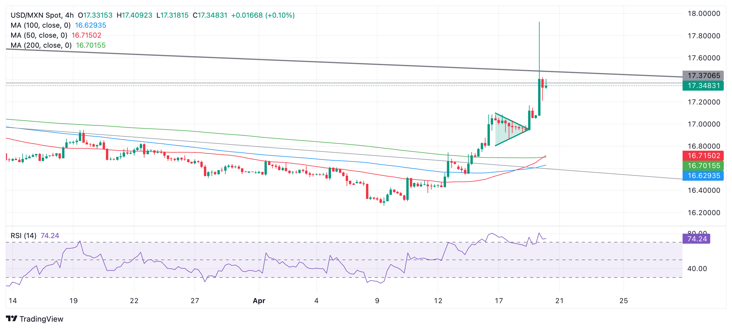 周五,墨西哥比索(MXN)在经历了剧烈波动的24小时后,交易价格达到17.20美元,由于大量资金逃离安全地带,一些货币对贬值超过5个百分点。 有消息称,以色列为报复伊朗4月13日对以色列发动的无人机袭