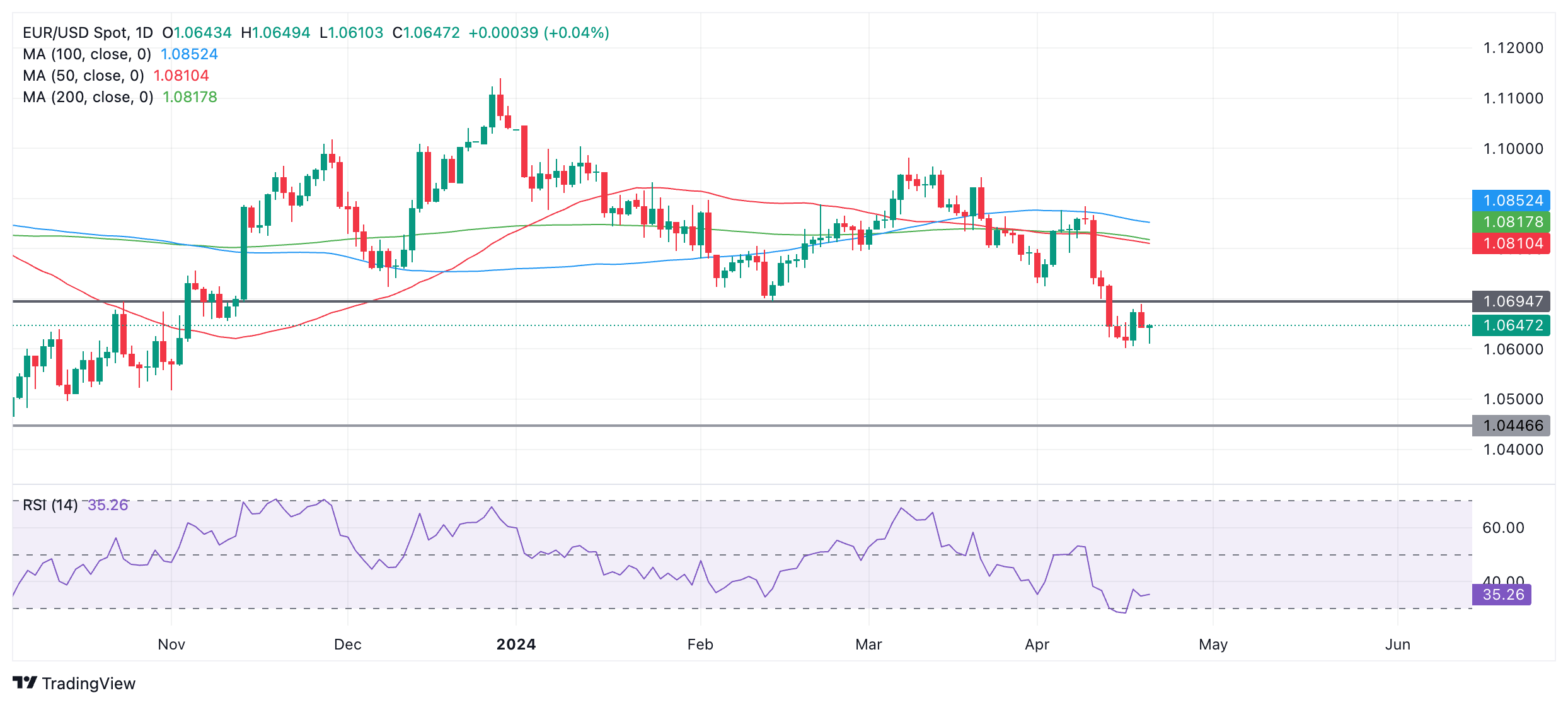 由于中东冲突升级的消息,欧元兑美元在早些时候遭遇抛售后已经回升。 据称,以色列向伊朗发射无人机是为了报复伊朗4月13日的袭击。 欧元兑美元在下行趋势中进行盘整。 在从早期的疲软中反弹之后,欧元兑美元在