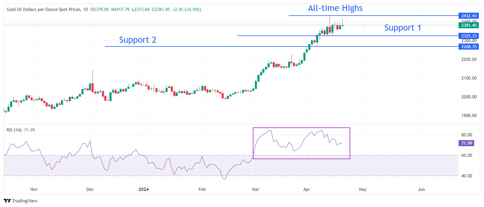 周五欧洲时段,金价(XAU/USD)面临压力,难以在2430美元附近夺回历史新高。受中东紧张局势恶化后避险资金流入的支撑,贵金属仍保持一定的盘中涨幅。据路透社报道,以色列周五对伊朗发动了报复性袭击,目