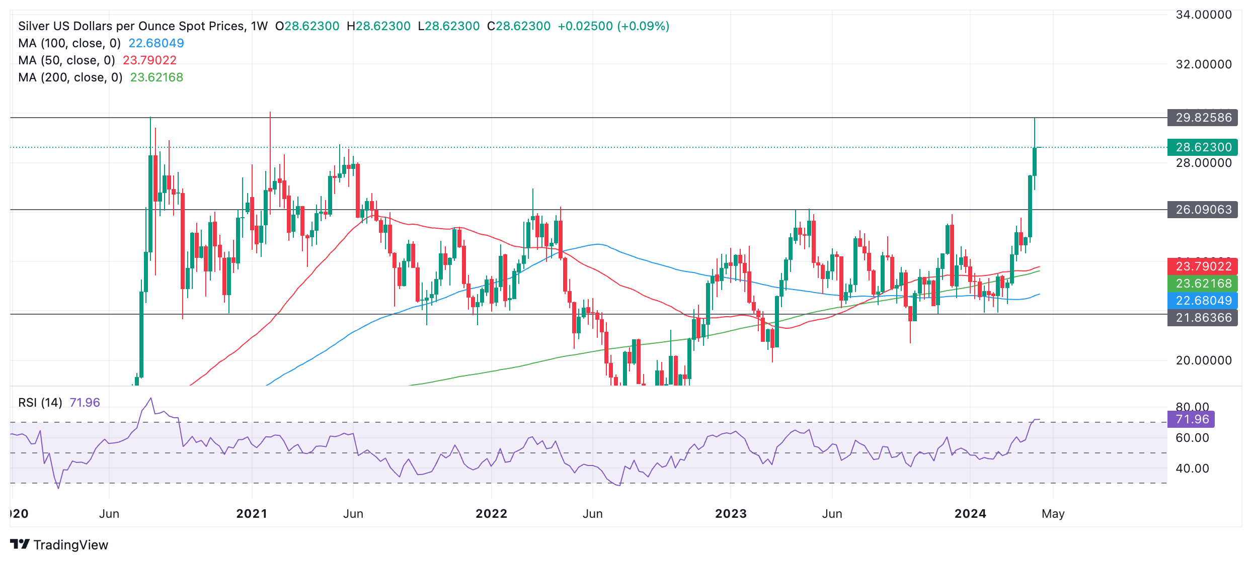 白银(XAG/USD)已经突破了自 2023 年初以来的窄幅震荡区间(大约在 21.00 美元至 26.00 美元之间),并升至更大盘整区间的顶部。