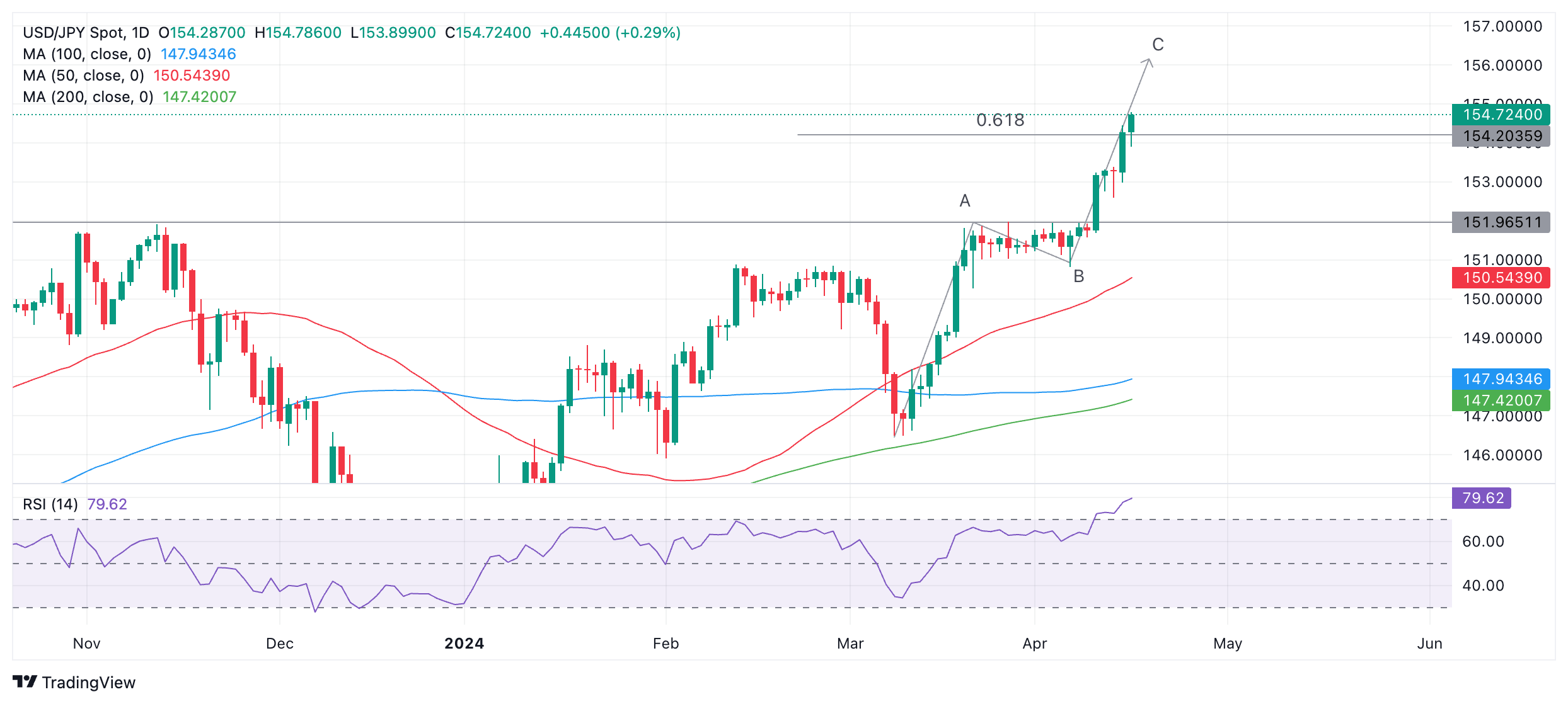 美元/日元在 154.00 上方交投。它已经形成了一个看似 "测量移动 "的价格形态,由三个波浪组成,通常标记为 A、B 和 C。