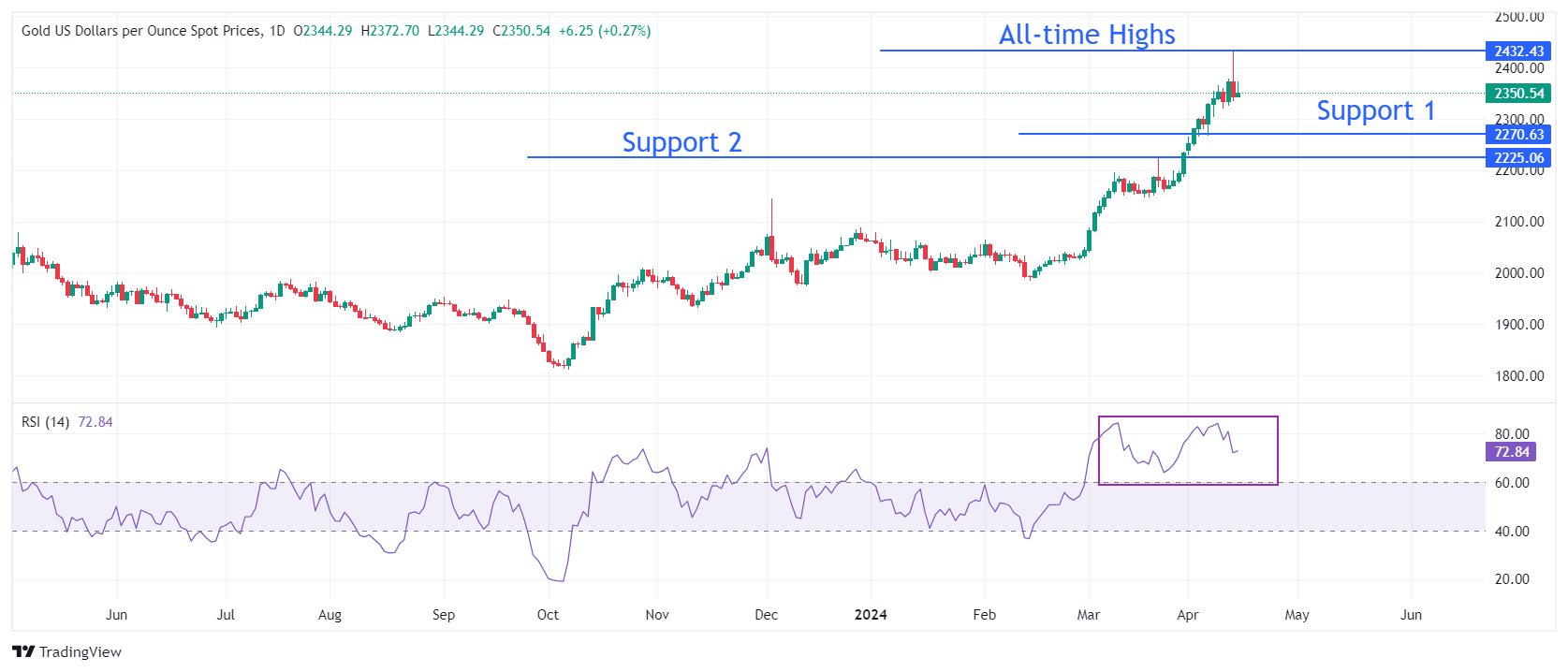 金价从2,430美元附近的新高回落,因投资者认为中东紧张局势不会进一步升级。 美国国债收益率飙升,美联储似乎将启动从9月开始的降息周期。 由于美国零售销售数据强劲,美元表现强势。 周一纽约早盘,黄金价