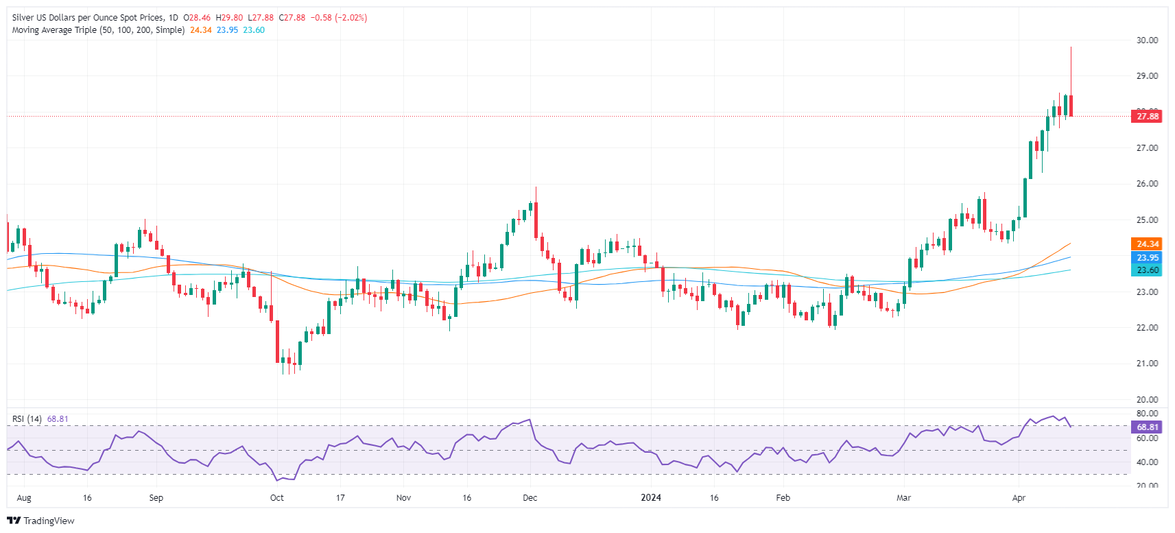 银价继刷新 2021 年 2 月触及的三年高点后,于周五盘中下跌。银价最高触及 29.79 美元,随后暴跌近 2 美元。银价报 27.84 美元,下跌 2.01%。