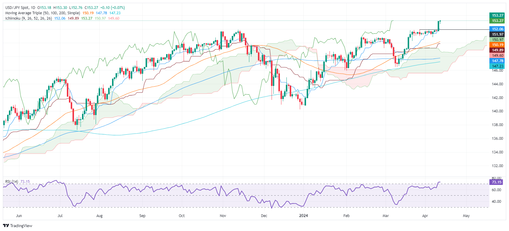 美元兑日元在北美时段攀升,尽管日本当局对日元(JPY)的过度波动发出了警告,但美元兑日元仍保持在 153.00 上方。美国(US)的进一步数据显示通胀率比预期的要高,这给美联储带来了压力。截至发稿时,