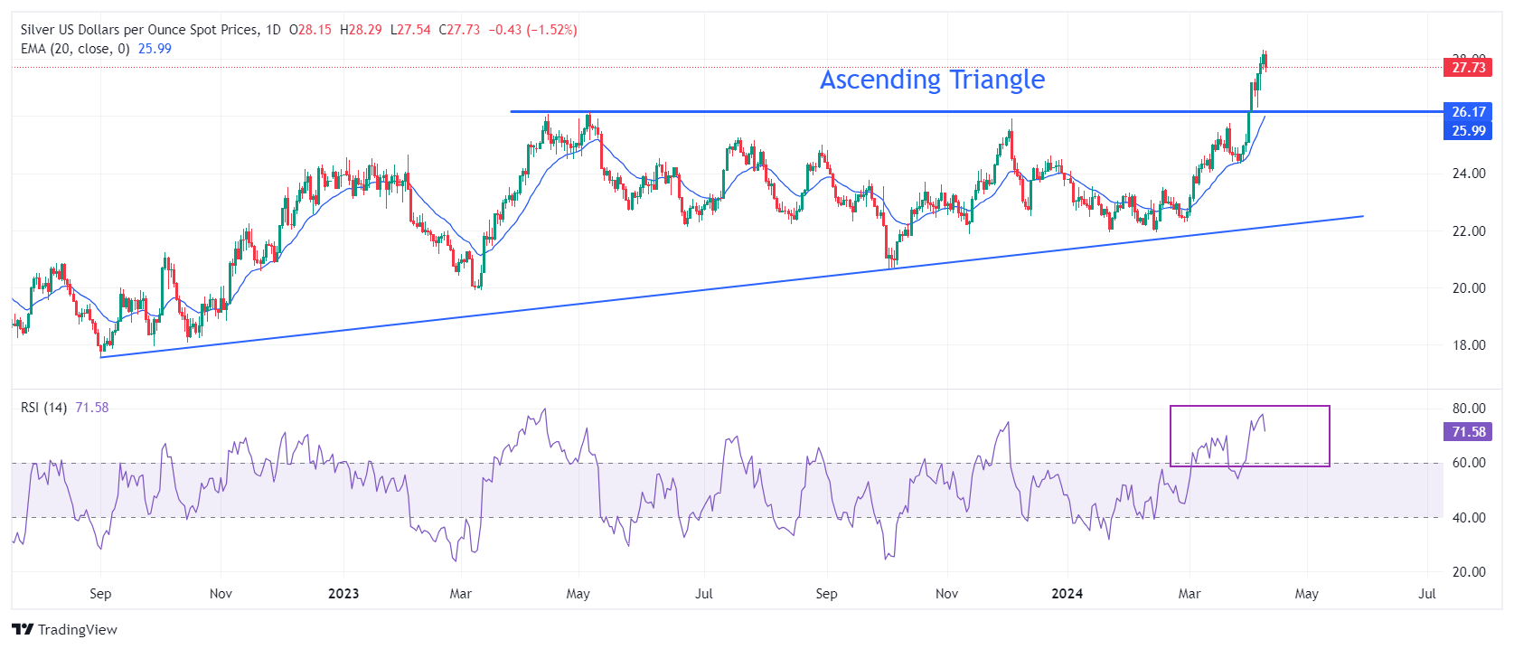 在美国劳工统计局(BLS)公布消费者物价通胀率呈胶着状态后,白银价格(XAG/USD)从两年新高 28.36 美元回落。火热的通胀数据加上强劲的 3 月份薪资数据,削弱了市场对美联储(Fed)从 6