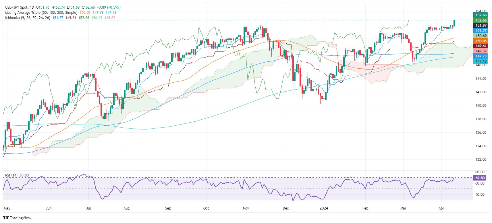 美元/日元徘徊于 153.00 附近,创 1990 年 7 月以来最高水平,重点是干预风险