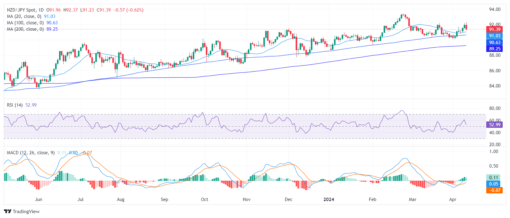纽元/日元跌至 91.33 点附近,表明纽元/日元挣扎于看好市场的乐观情绪与不断增加的看跌压力之间。由于纽元/日元保持在关键的简单移动均线(SMA)水平上方,市场趋势倾向于看涨;然而,动能转向下行,表