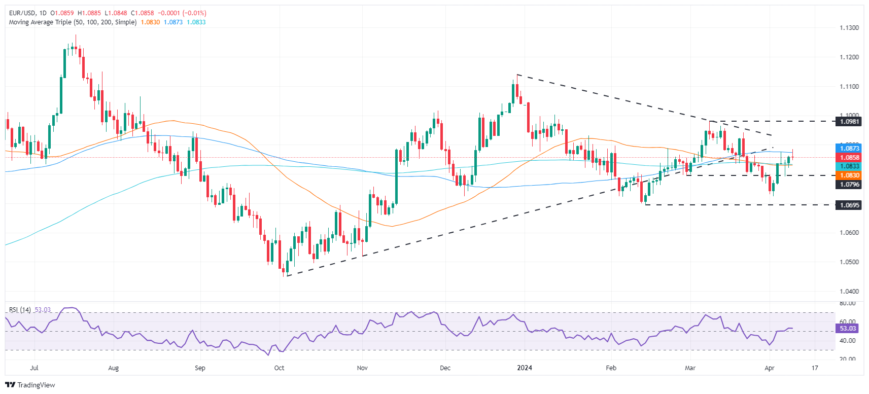 欧元/美元未走强,微幅下跌 0.02%,但仍徘徊在 1.0850 附近,欧元/美元处在动态支撑位和阻力位,即每日移动均线区间。