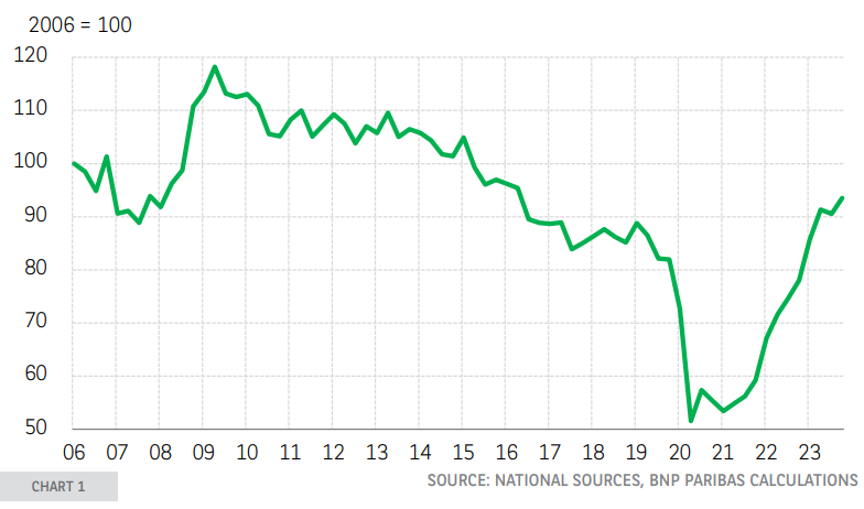 我们的西欧企业破产指数已高于疫情前的水平。然而,这仍远低于2008年危机后和欧元区危机期间(2011年至2015年)的峰值。在大多数国家,企业破产水平现在高于大流行前的水平。自2022年以来,英国和瑞
