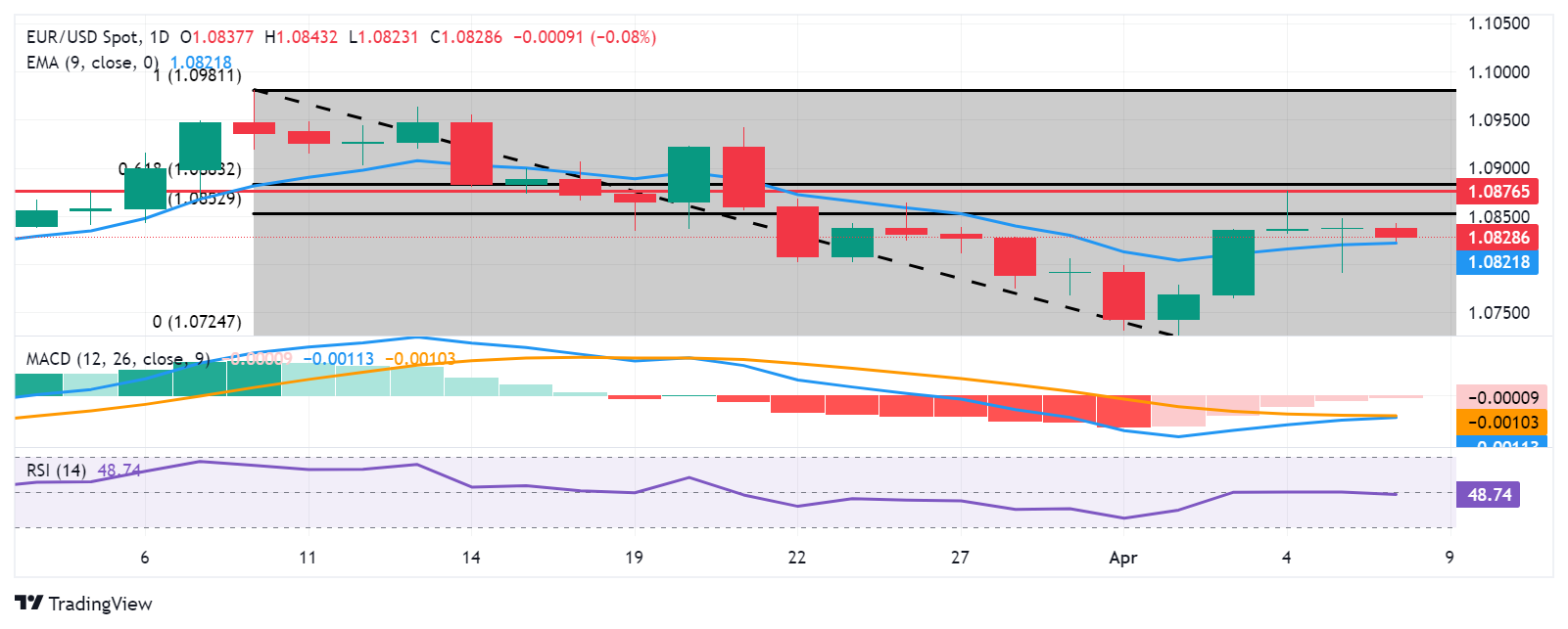 欧元/美元在周一欧洲早盘时段跌至1.0830附近,中断了四日连涨势头。该货币对可能下行,重新测试九天指数移动平均线(EMA)1.0822。