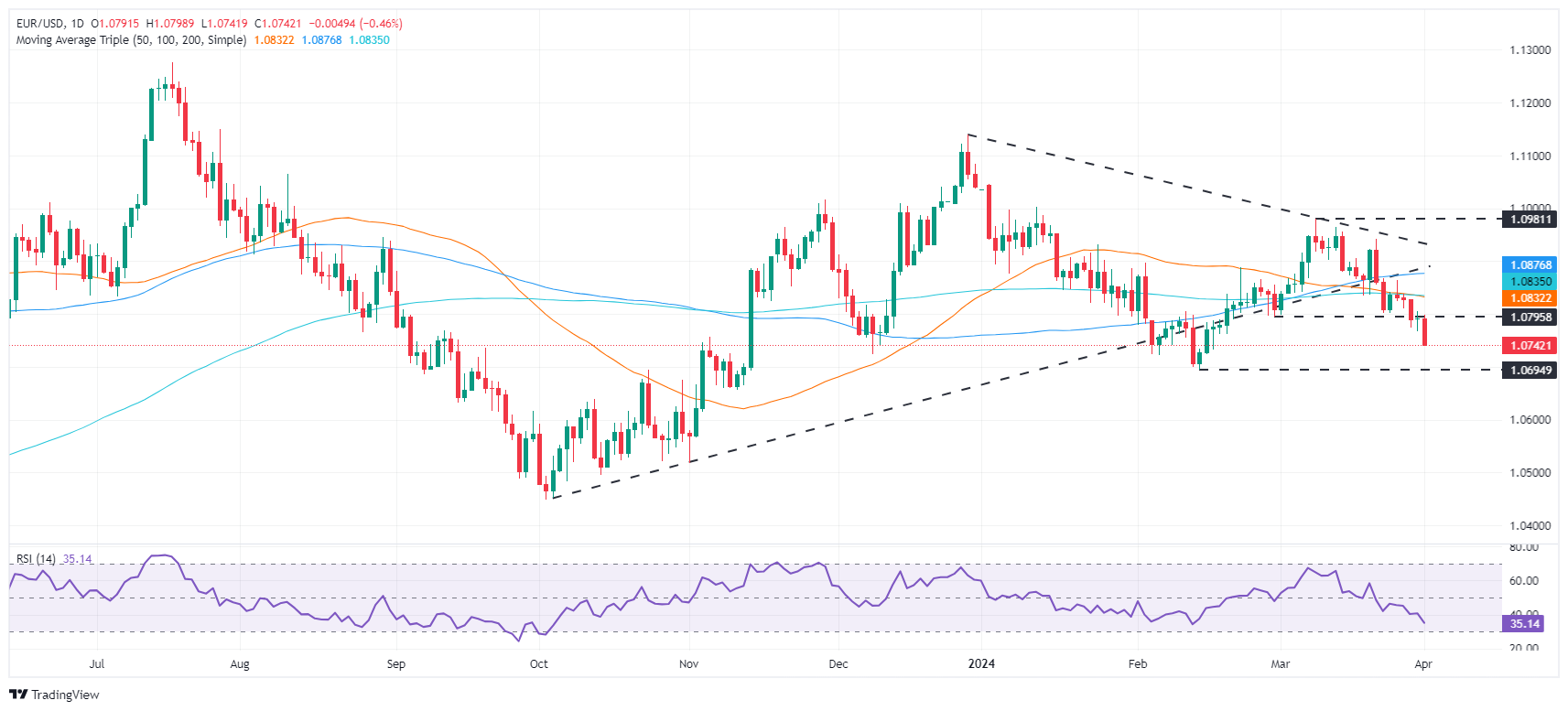 欧元兑美元跌幅扩大,大多数欧洲市场因复活节周一休市。美国数据推动 欧元/美元下跌,跌幅超过 0.40%,报 1.0742。