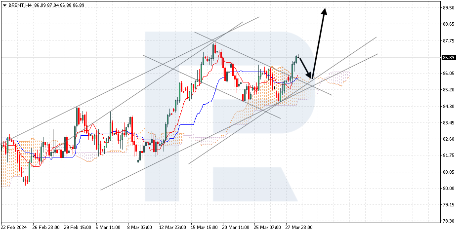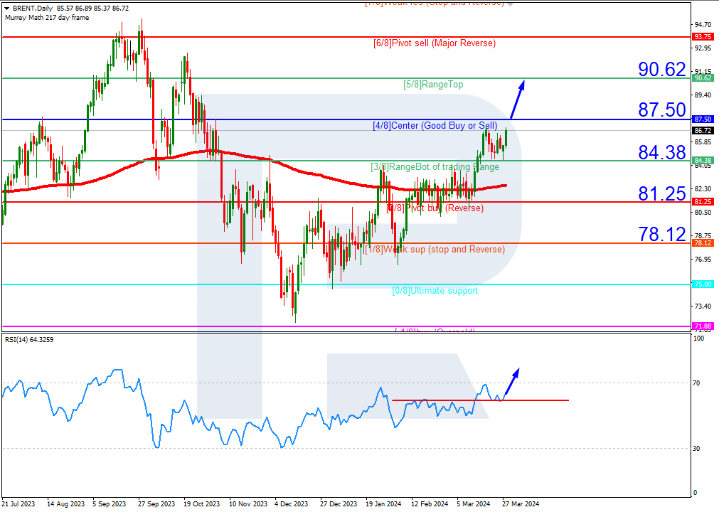 布伦特原油 布伦特原油高于200日均线,反映升势继续。RSI自支撑线反弹。在这种情况下,预计油价将自4/8 (87.50)反弹,然后升向位于5/8 (90.62)的阻力位。突破3/8 (84.38)其