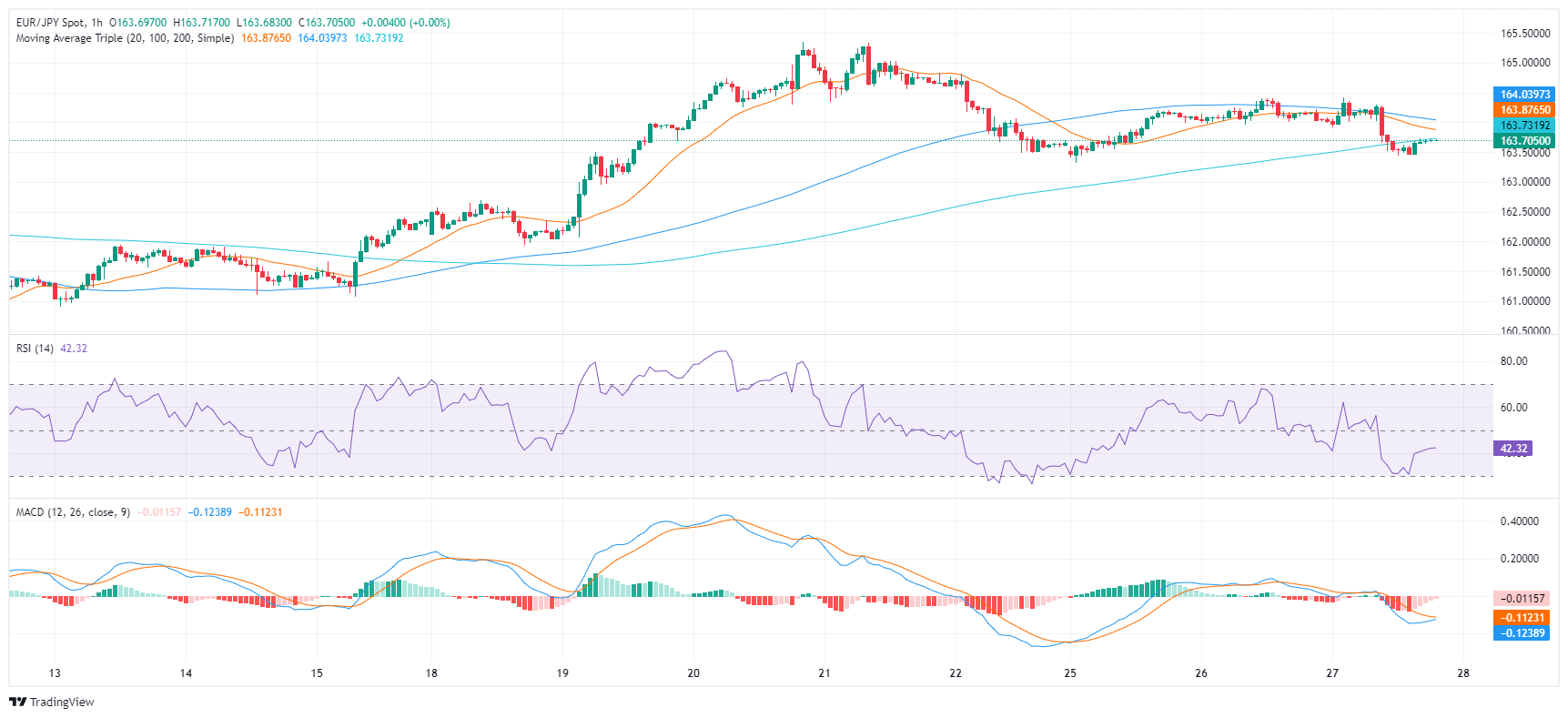 周三盘中,欧元/日元温和下跌,报 163.75 点。尽管存在不确定性,但鉴于欧元/日元处在关键的简单移动均线(SMA)20、100 和 200 日均线上方,市场整体情绪似乎有利于买方。不过,相对强弱指