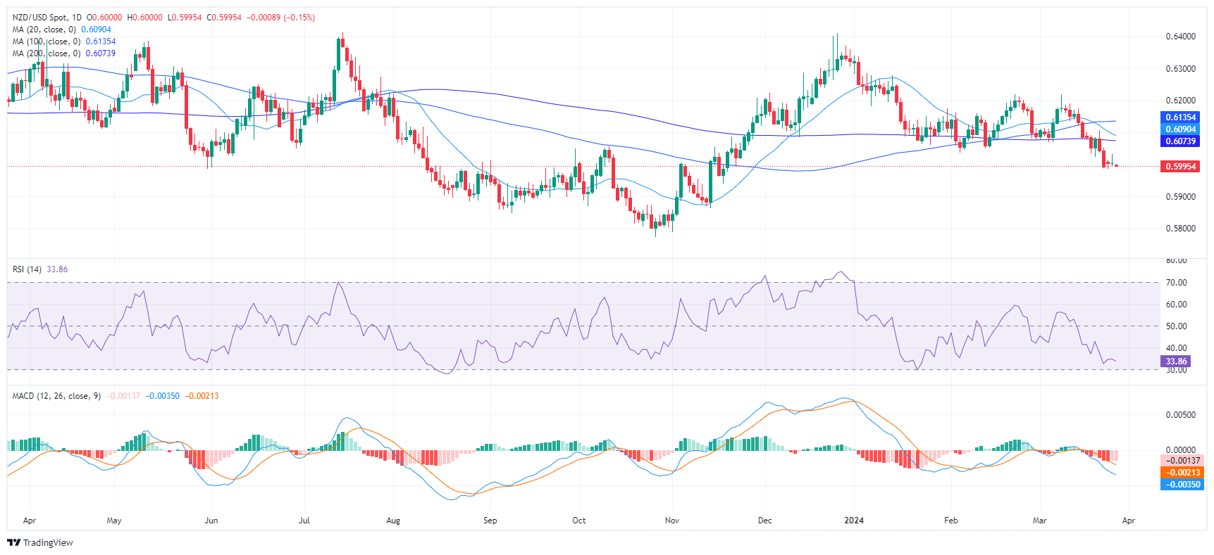 纽元/美元在0.6000附近震荡下行,市场格局主要由空头主导,维持总体看跌趋势。纽元/美元位于重要的 20 日、100 日和 200 日简单移动均线 (SMA) 下方,强调了空头强势存在。不过,小时图