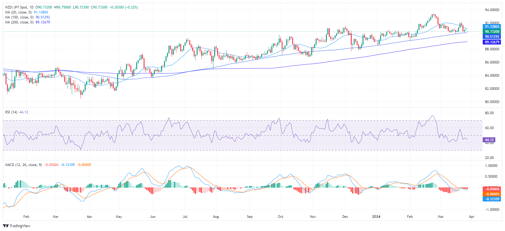 纽元/日元目前交投于90.90,继收窄日线涨幅后基本呈中性。从更大级别周期来看,纽元/日元位于 100 日和 200 日简单移动均线(SMA)上方,表明尽管买盘势头减弱,但多头仍继续占据主导。多头必须